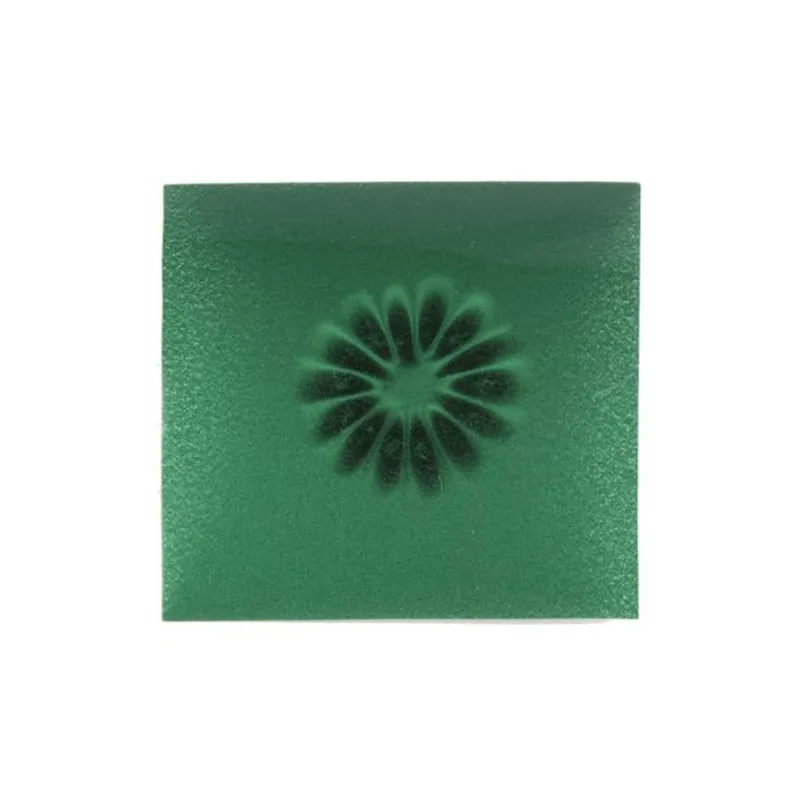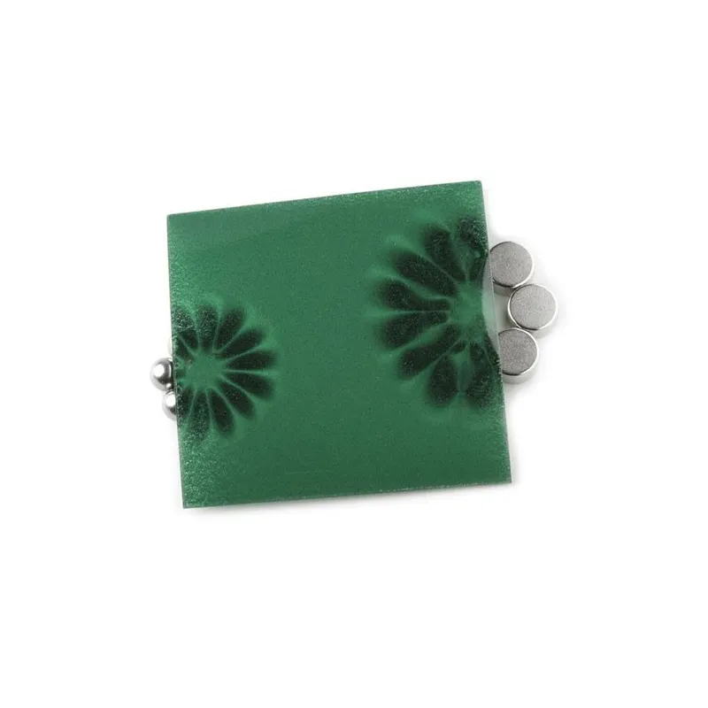 Когато магнитът бъде поставен под наблюдателното фолио, металните люспи реагират на магнитното поле, образувайки форми, които наподобяват модела на магнитизация. Бялата линия показва разделението между северния и южния полюс на магнита. Добавете линияалка и можете да измервате полюсите на инч.