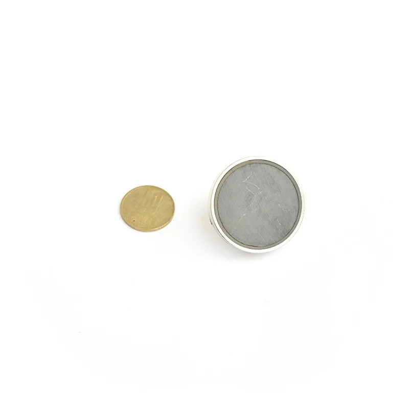 Този магнит предлага отлично съотношение цена/сила. Магнитите са изработени от феритен магнит, вграден в стоманен корпус, което означава, че северният полюс се намира в центъра на магнитната повърхност, а южният полюс - по външния ръб. Стоманеният корпус увеличава магнитната сила, като им осигурява здрав захват спрямо размера. Допълнителен плюс е, че корпусът предпазва феритното ядро от удари, като се има предвид, че феритът е сравнително крехък материал.