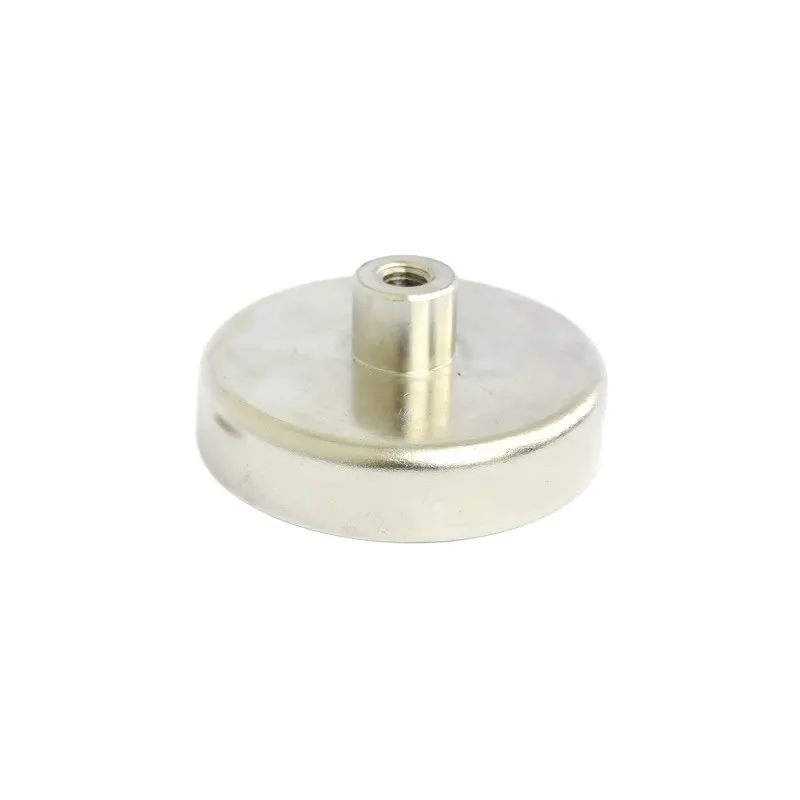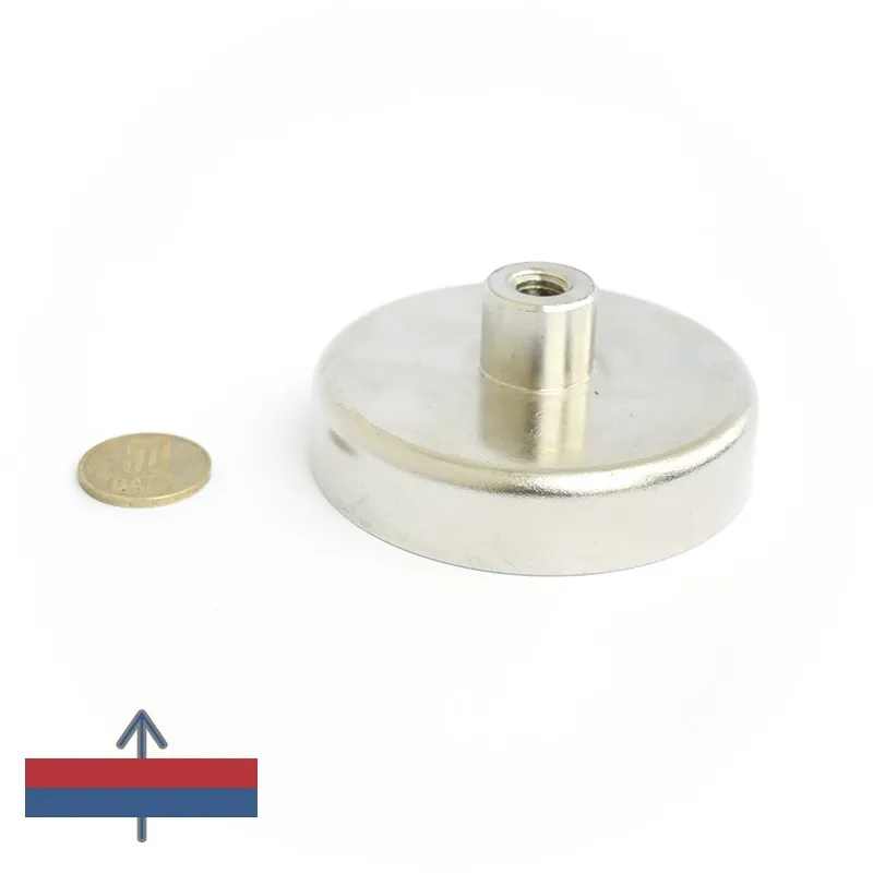 Феритен магнит тип „тенджера“ с феритно ядро, диаметър 80 мм, Y30BH, със сила на задържане 56 кг, с вътрешна резба за завиване на кука. Магнитът се доставя без кука за закрепване към корпуса. Защитният корпус на магнита – „тенджерата“ – е обработен с никел, което осигурява защита от корозия.