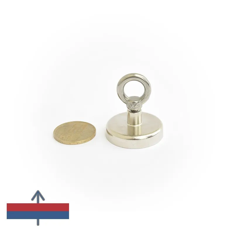 Феритен магнит тип „тенджера“, диаметър 32 мм, Y30BH, с приблизителна сила на задържане 8 кг, с вътрешна резба за завиване на кука. Магнитът се доставя и с пръстеновидна/открита кука (както е на основното изображение), с резба за закрепване към магнитната „тенджера“. Защита срещу корозия се осигурява чрез никелово покритие на корпуса.
