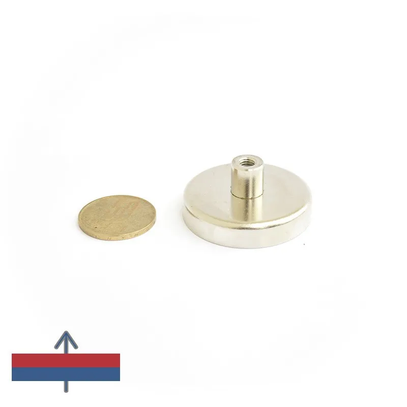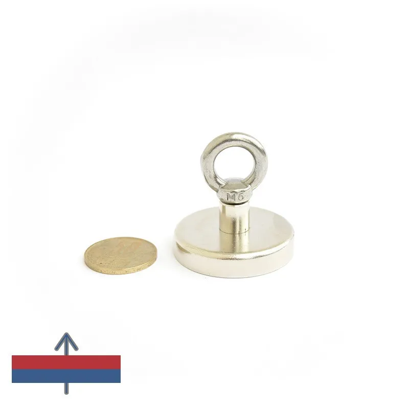 Феритен магнит тип „тенджера“, диаметър 40 мм, Y30BH, със сила на задържане 12 кг, с вътрешна резба за завиване на кука. Магнитът се доставя с пръстеновидна или отворена кука (както е на основното изображение), навита за закрепване към магнитната „тенджера“. Защита срещу корозия се осигурява чрез никелово покритие на корпуса на магнита.