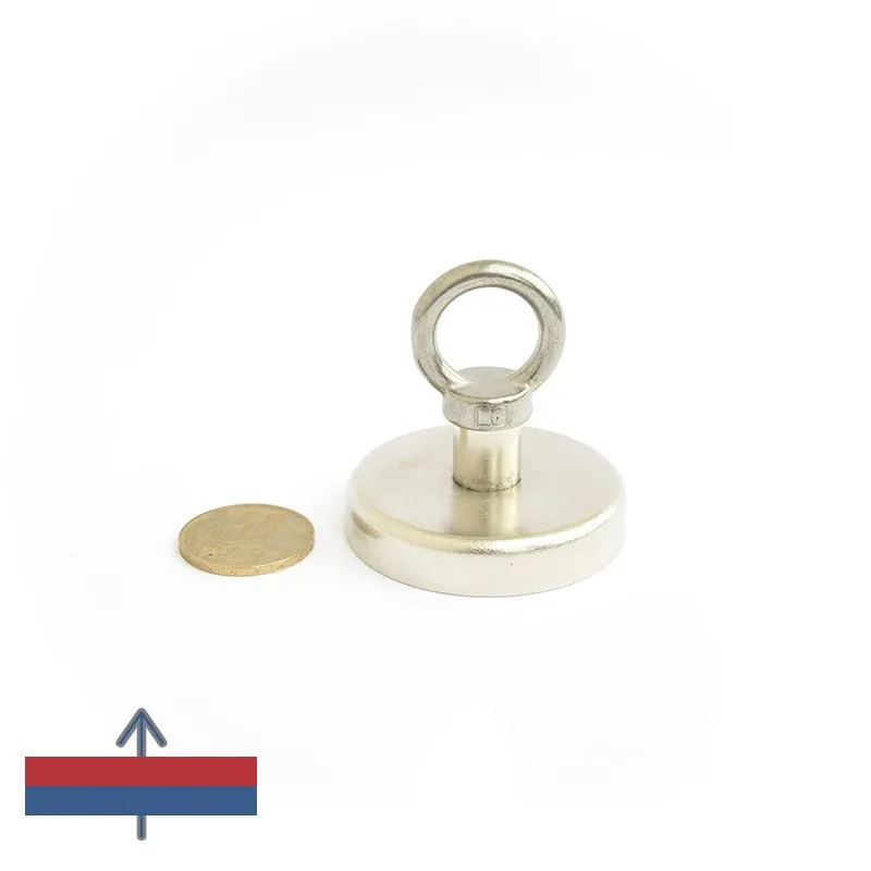 Феритен магнит тип „тенджера“, диаметър 50 мм, Y30BH, със сила на задържане 22 кг, с вътрешна резба за завиване на кука. Магнитът се доставя с пръстеновидна/отворена кука (както е показано на основното изображение), с резбова връзка за закрепване към магнитната „тенджера“. Корпусът на магнита е обработен с никел за защита от корозия.