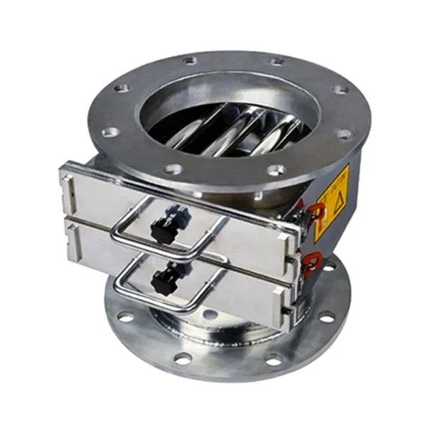 Кръгъл магнитен сепаратор с две правоъгълни решетки и кръгъл фланец е механично устройство, използвано за отделяне на метални частици от зърнени култури, керамика, огнеупорни материали, стъкло, химическа индустрия, медицина, хранително-вкусова промишленост и други отрасли. Основното му приложение е отстраняване на слаби магнитни оксиди от фини частици или прахове. Този сепаратор е проектиран с мощни неодимови магнити, които осигуряват ефективно улавяне на замърсители с всякакви размери – от най-малките до по-големите.