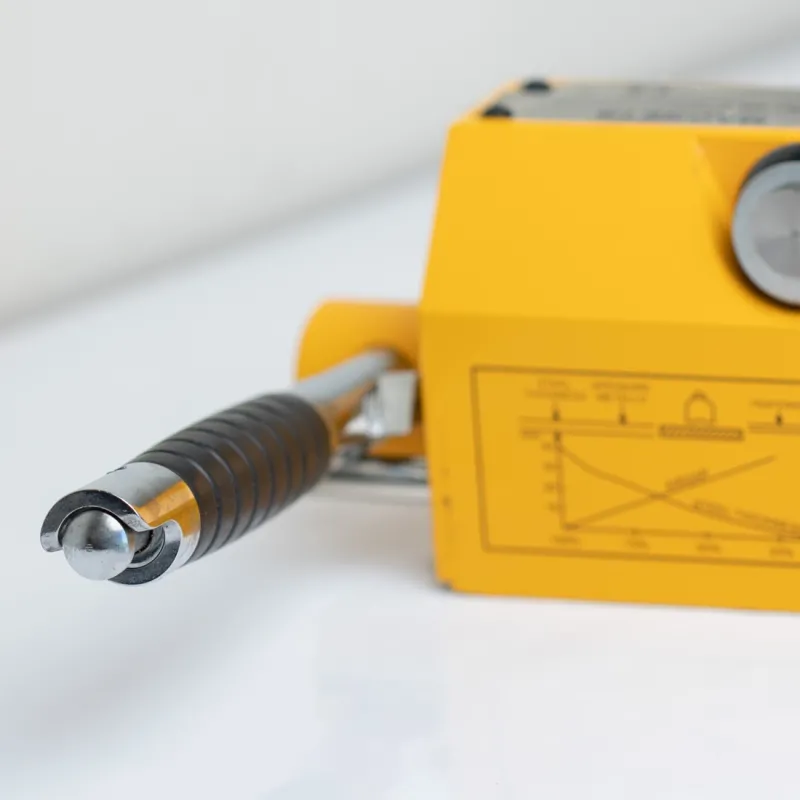 - Лесно управление на манивелата: Чрез манивелата се насочва или блокира магнитното поле в устройството, което позволява контрол на магнитната сила без електричество. Завъртането на манивелата насочва магнитния поток вътре в устройството, спирайки привличането. Завъртането в обратна посока насочва магнитния поток към предмета за повдигане, увеличавайки магнитното привличане. Манивелата може да бъде заключена с винт за безопасност.