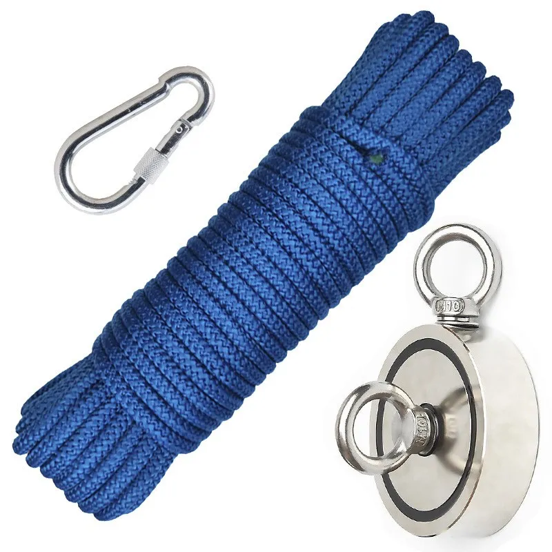 Комплект за магнитен риболов: магнит тип „тенджера“ с диаметър 94 мм, две лица, въже 8 мм/20 м и карабинер. Това е лесен, евтин и универсален комплект с много мощен магнит с сила 300 кг. Този комплект ви предлага всичко необходимо, за да започнете магнитен риболов. Специалното при този магнит е, че има две лица, което прави риболова по-гъвкав. Магнитът е подходящ и за влачене по дъното на водоем, тъй като „почиства“ повърхността с едната си страна надолу, дори и когато се обърне.