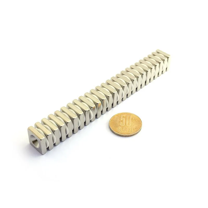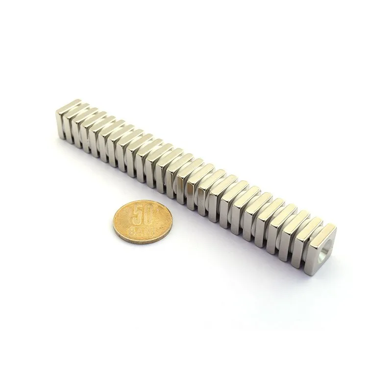 Неодимови магнити с основна форма на паралелепипед, но с вградено отворче в средата. Този отвор позволява фиксиране на магнитите с помощта на винтове. С дебелина само 4 мм, тези магнити са много дискретни и полезни при изработката на мебели и модерни кухни, при изграждането на рафтове за изложба в магазини, и за окачване на различни предмети като инструменти, знаци и др.