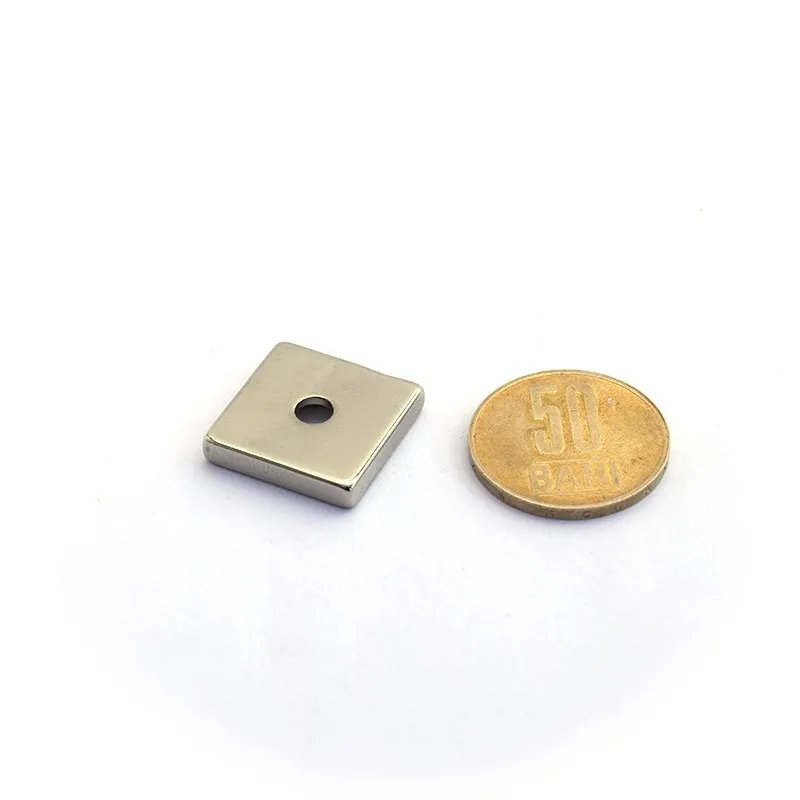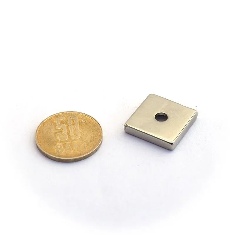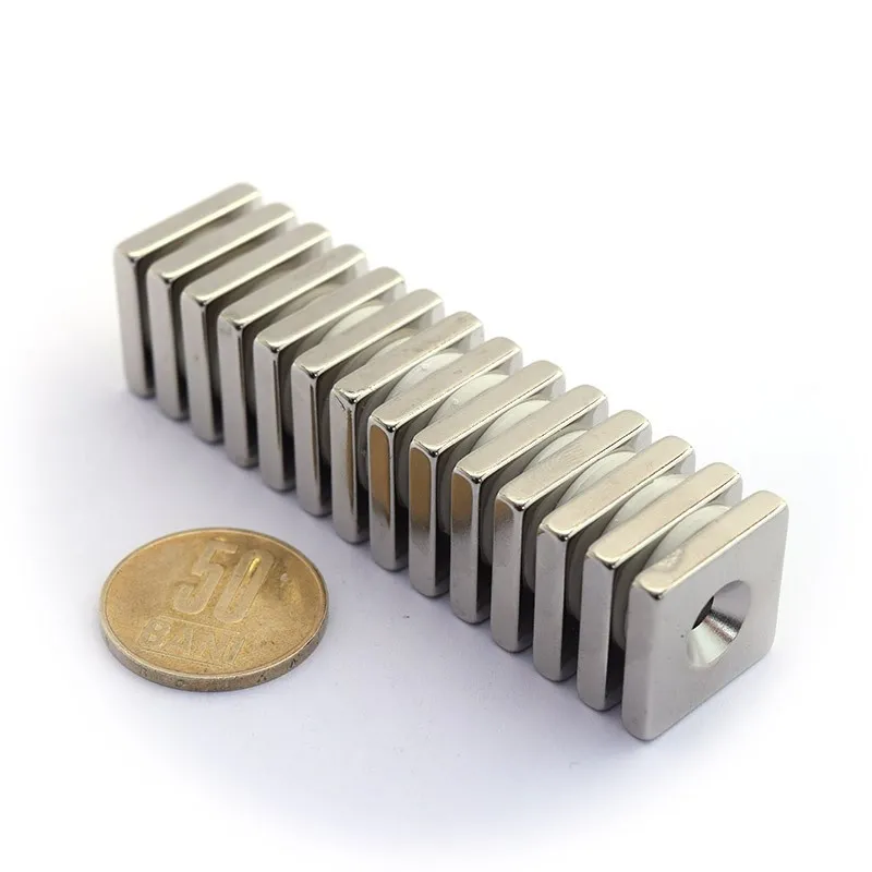 Неодимови магнити с основна форма на паралелепипед, които имат и вграден отвор в средата. Този отвор позволява фиксиране на магнитите с винтове. С дебелина само 4 мм, тези магнити са много дискретни и полезни при изработката на мебели и модерни кухни, при създаване на рафтове за изложба в магазини, както и за окачване на различни предмети като инструменти, знаци и др.