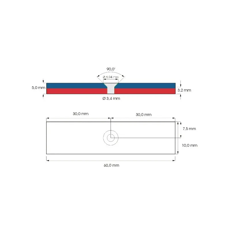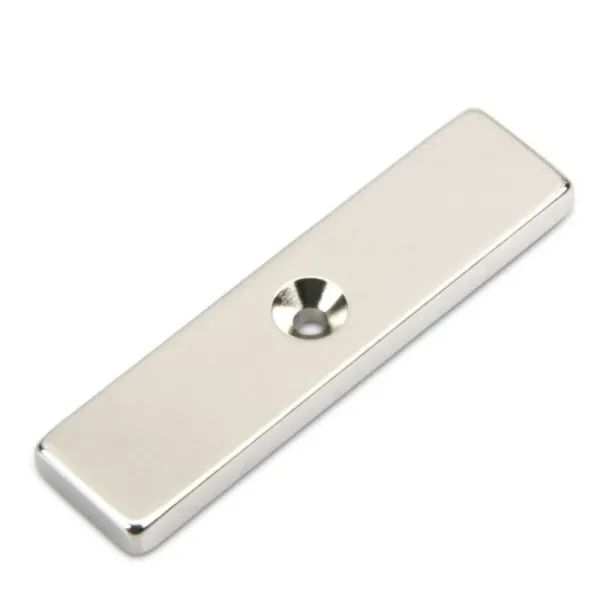 Силен неодимов магнит блок 60 x 15 x 5 мм с отвор с фаска / потъващ D 3,4 / D 6,94 мм, никелирано покритие, N45, сила приблизително 8 кг. Неодимови магнити, оборудвани с отвор за закрепване с винт.