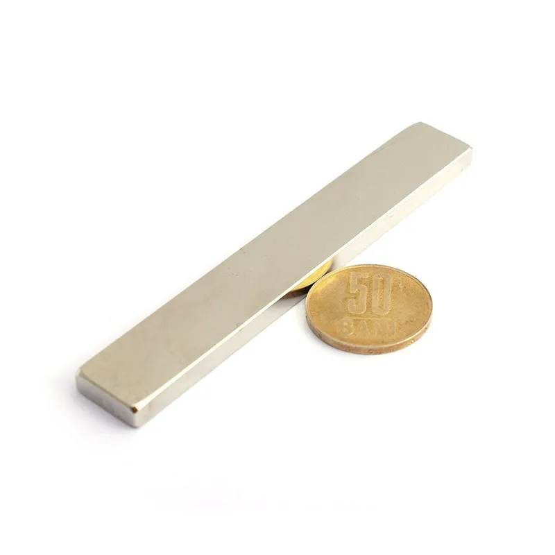 Силен неодимов магнит с форма на блок, покрит с никел, намагнитване N52, с приблизителна сила около 18 кг.