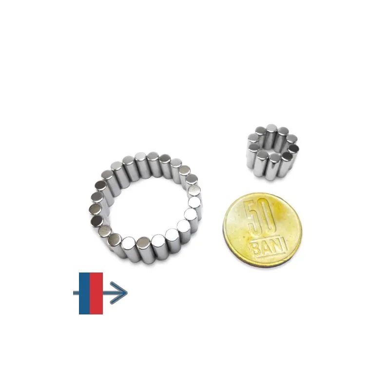Специални неодимови цилиндрични магнити с диаметрална магнитизация. Терминът „диаметрална магнитизация“ означава, че двата полюса се намират на извитата повърхност на магнита - вижте графичното представяне. С други думи, тези магнити имат сила на привличане по страни и се съединяват един с друг като в кръшна хора. Този тип магнити са доста редки, тъй като диаметралната магнитизация не се използва широко. Магнитите с диаметрална магнитизация са полезни в някои научни експерименти, в изработката на сензори, но също така се използват и като магнитни бижута. Изключително лесно може да използвате комплект от този тип магнити, за да си направите собствена магнитна гривна.