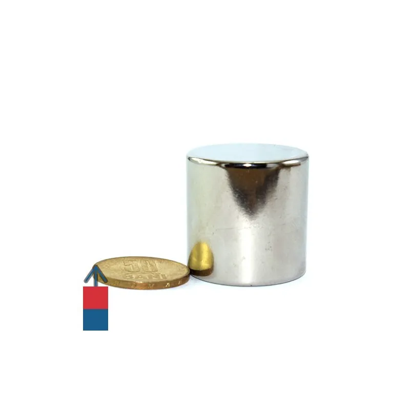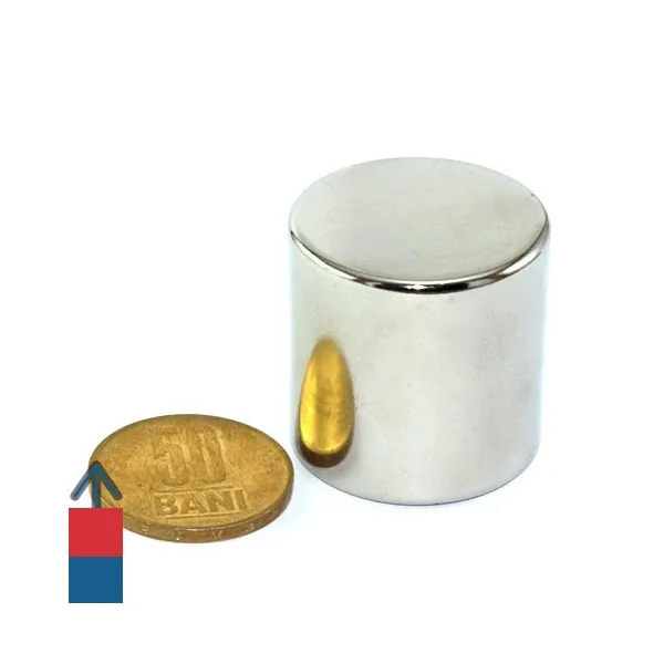 Неодимов магнит с цилиндрична форма, диаметър 30 мм и височина 30 мм. Съотношението 1:1 прави този магнит здрав и мощен. С магнитизация N45, при идеални условия магнитът достига теоретична сила от 35,50 кг. При такива размери се очаква магнитът да бъде изключително силен и трябва да се борави внимателно, за да се избегнат наранявания или повреди. Магнитното поле е силно и може да възпрепятства правилната работа на електронни устройства, затова не го доближавайте до електромери, електрически броячи, телевизори, часовници, пейсмейкъри и др. Този неодимов магнит се използва главно за: