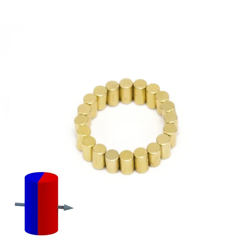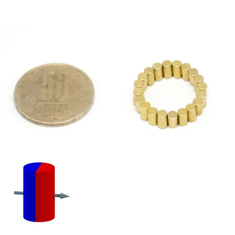 Силни неодимови магнити с форма на цилиндър, с диаметрално намагнитване, позлатени, намагнитване N40, с приблизителна сила 350 г.