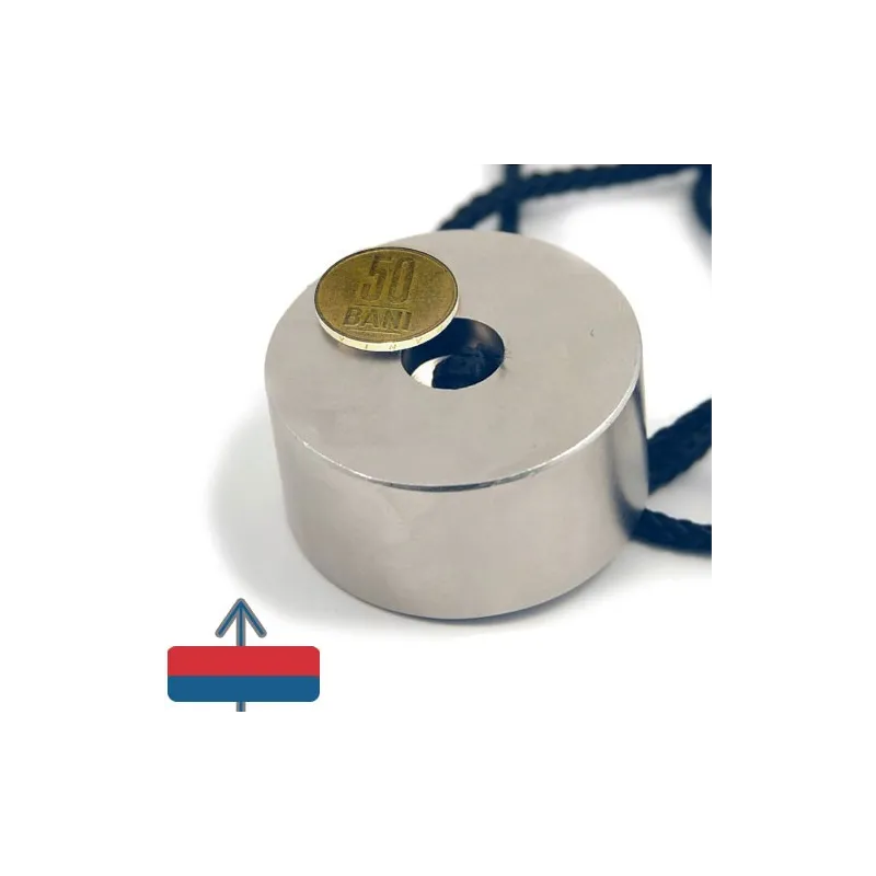 Огромен пръстеновиден магнит, който повече прилича на диск с отвор в средата, с изключителна привличаща сила от 120 кг. С такъв магнит може лесно да извадите, например, велосипед от река. Ако го завържете с въже, можете да извадите от езера или реки метални предмети с голямо тегло. Както всеки неодимов магнит с подобни размери, този е много силен и следователно изключително опасен. Не го препоръчваме за неподготвени потребители без опит с неодимови магнити. Моля, преди поръчка, прочетете внимателно страницата за Безопасност.