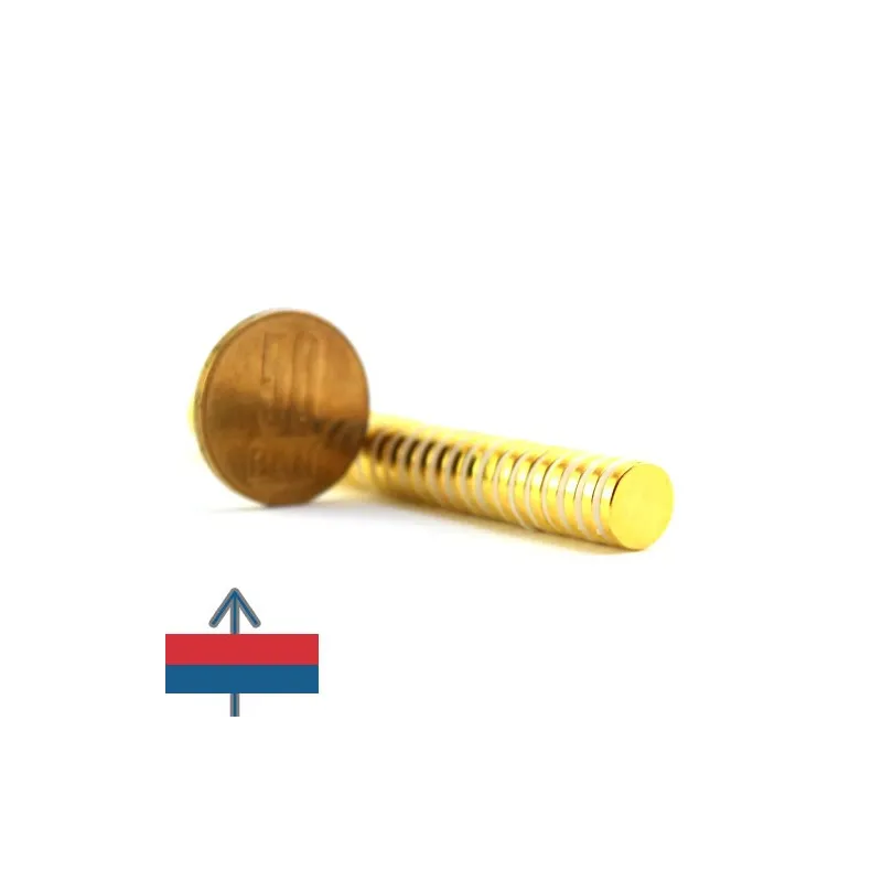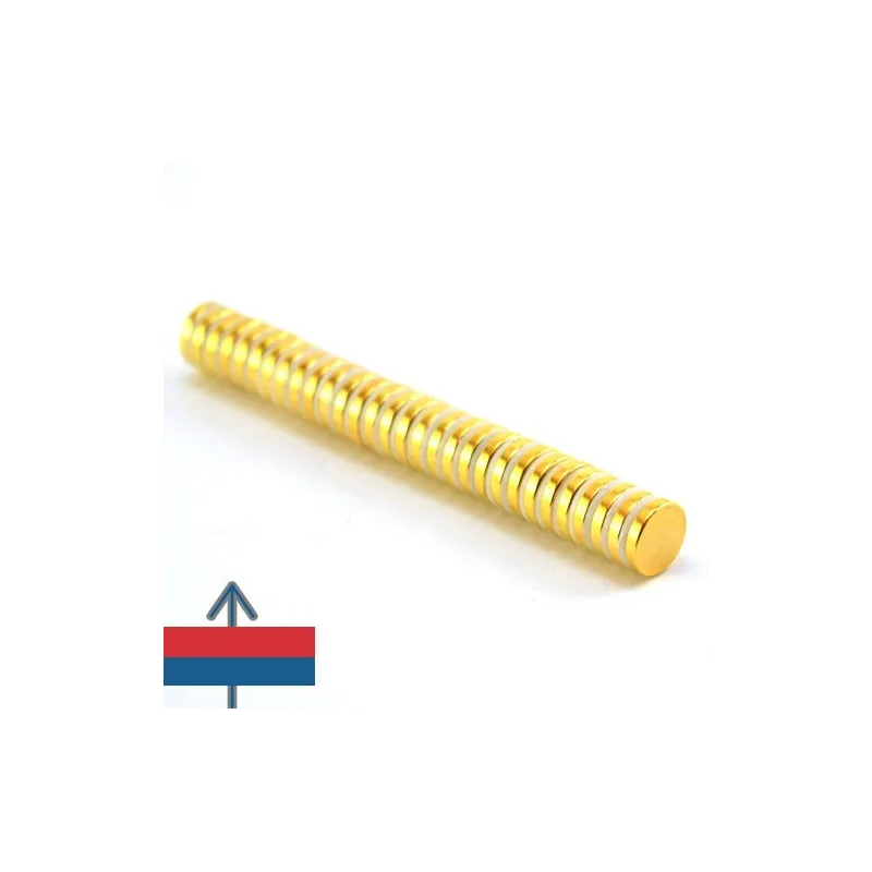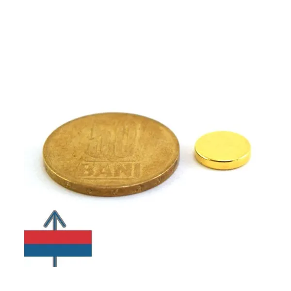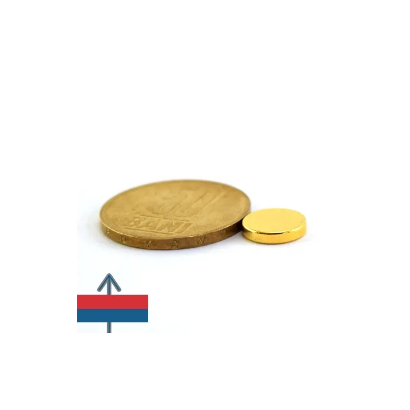 Тънки дискови неодимови магнити, полезни в широк спектър от приложения, където са необходими тънки, но мощни магнити. Златното покритие им придава елегантен вид, което ги препоръчва за приложения, където магнитът е видим (например, закрепване на бележки върху метална дъска в офиса). Ако външният вид не е важен, препоръчваме неодимовия магнит 10x2 никелиран, тъй като е по-евтин.