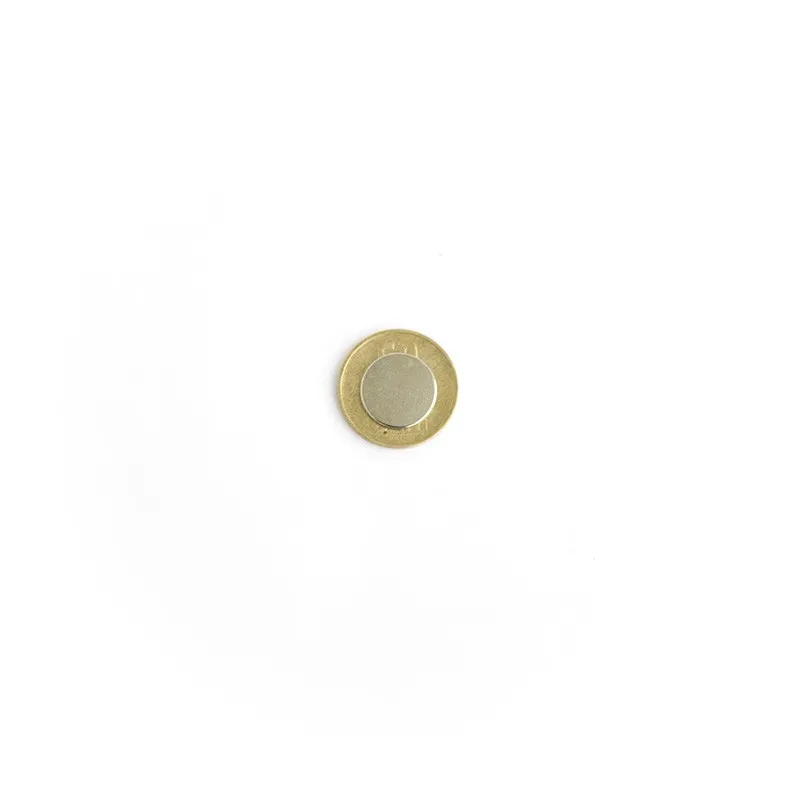 Неодимов магнит диск 15 x 1,5 мм изглед отгоре върху монета 50 стотинки