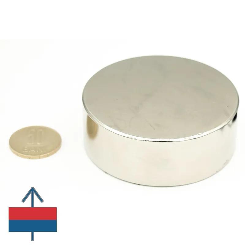 Много мощни неодимови магнити с диаметър 70 мм. Препоръчваме повишено внимание за неподготвените с работа с неодимови магнити: ако не се борави правилно, те лесно могат да причинят синини. Поради силното намагнитване N52, за да отделите магнита от плоска металева повърхност с дебелина минимум 2 см и високо съдържание на Fe, е необходима сила на дърпане перпендикулярно на повърхността около 130 кг. С този неодимов магнит можете да фиксирате, движите или повдигате метални предмети. Обикновено този тип магнит се използва за: