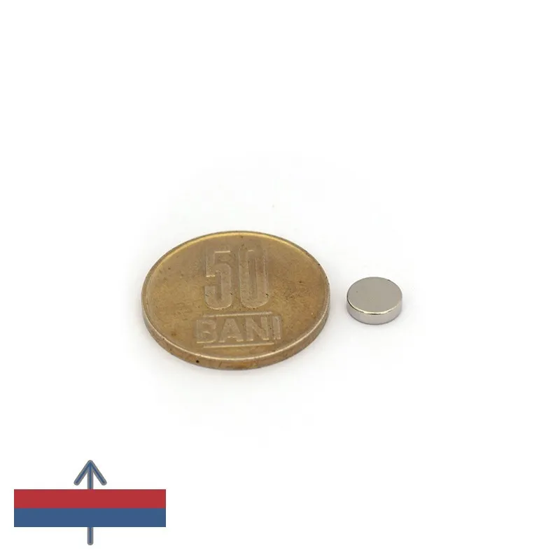 Мощни неодимови магнити във форма на диск с много добра магнитизация N52, покрити с никел, с сила на привличане 140 г (0,14 кг). Подходящи спрямо размерите си.