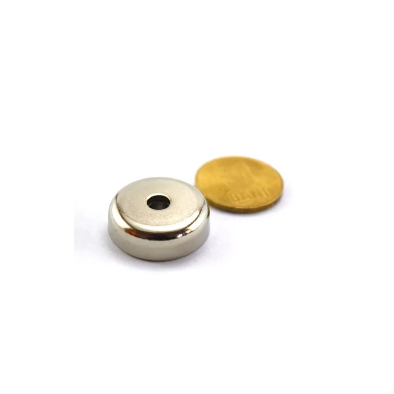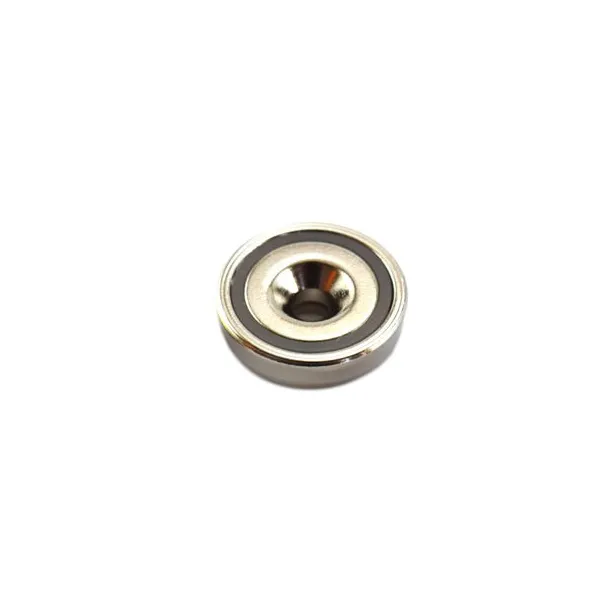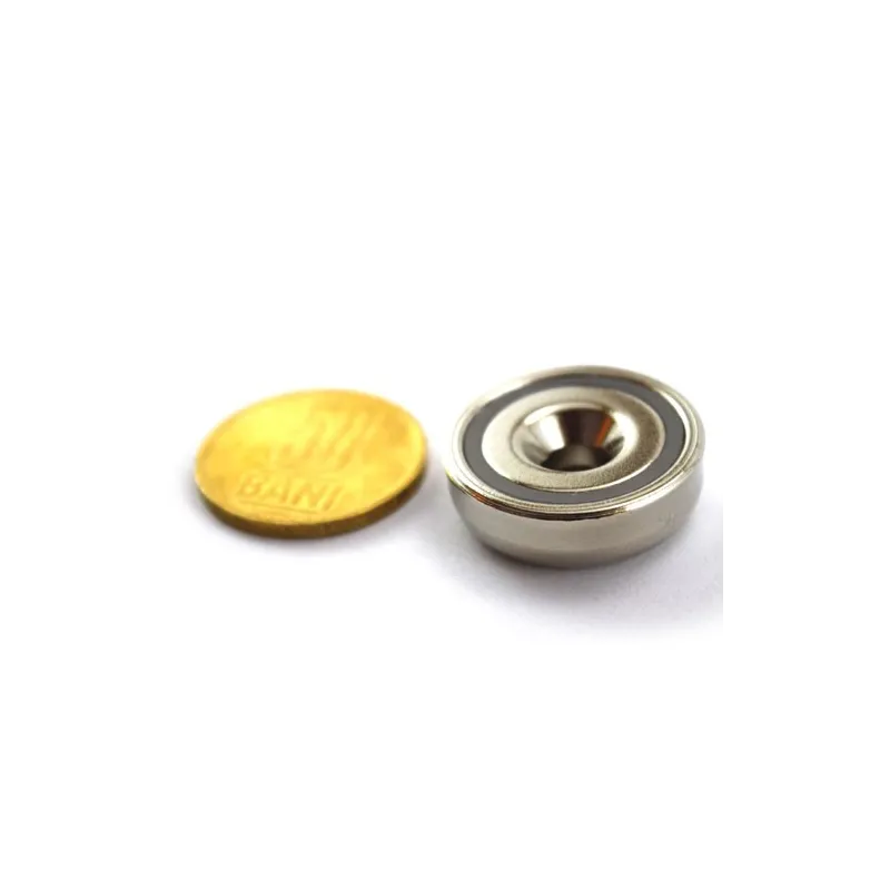 Неодимови магнити тип "тенджера", снабдени с отвор в средата, подходящ за закрепване с винтове с потънал глава. Корпусът е изработен от стомана и е покрит с никел, а сърцевината е неодимов магнит. Може да поддържа до 15 кг (при идеални условия), ако силата на отлепване действа перпендикулярно на контактната повърхност. Въпреки сходството във визуалния си вид, този магнит не е предназначен за използване като алармен детектор.