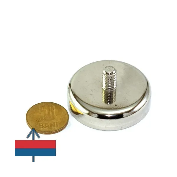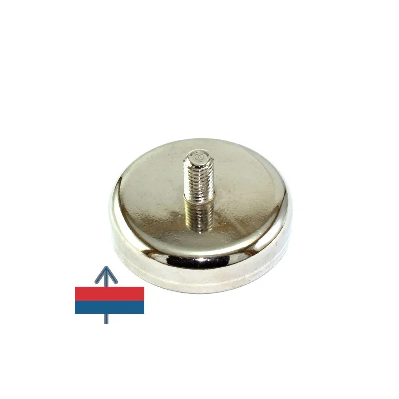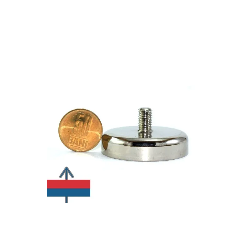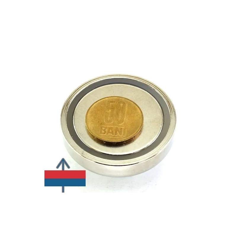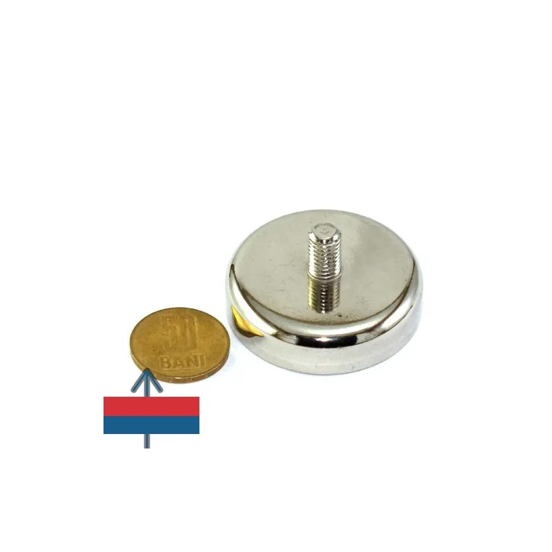 Силен неодимов магнит тип "тенджера", никелово покритие, с сила на задържане приблизително 75 кг при контакт и диаметър 48 мм.