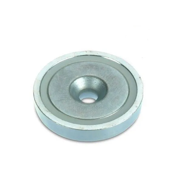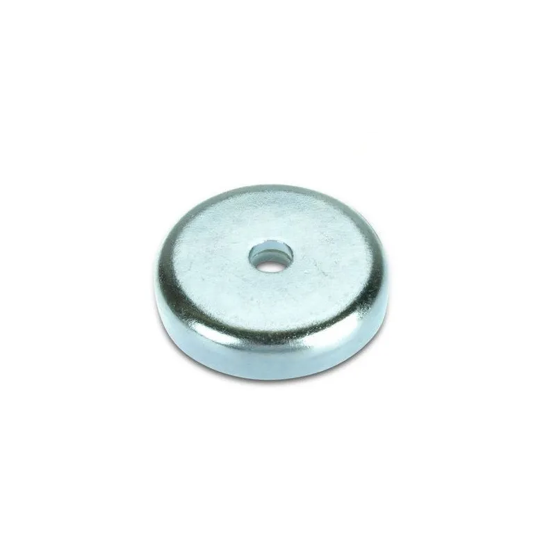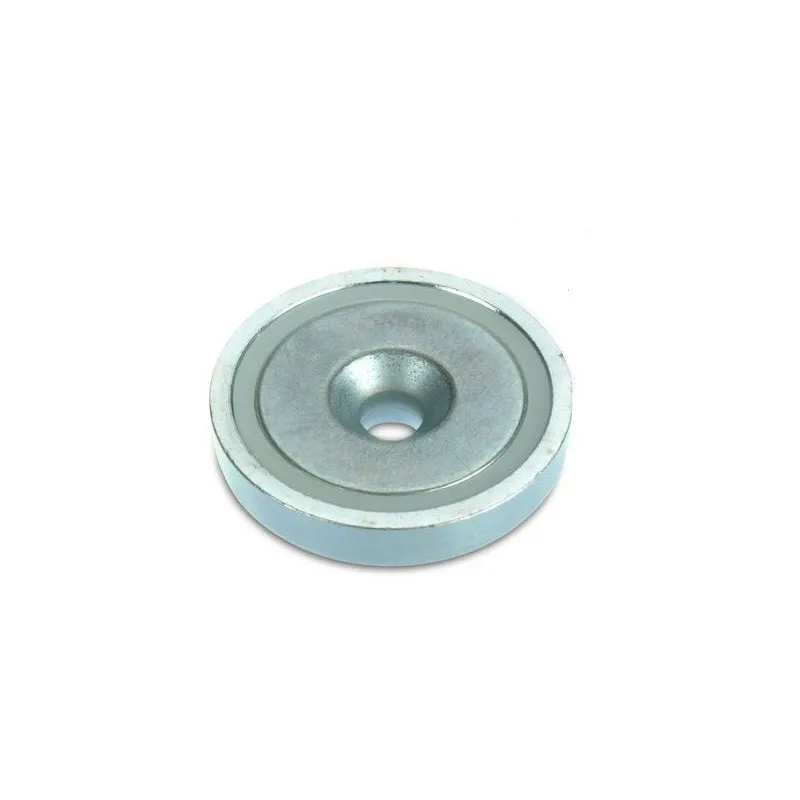 Този магнит тип „тенджера“ разполага с централен отвор, който позволява закрепване с различни видове винтове с потънал глава. Ядрото е неодимов магнит, а корпусът е изработен от стомана и покрит с поцинковано покритие.