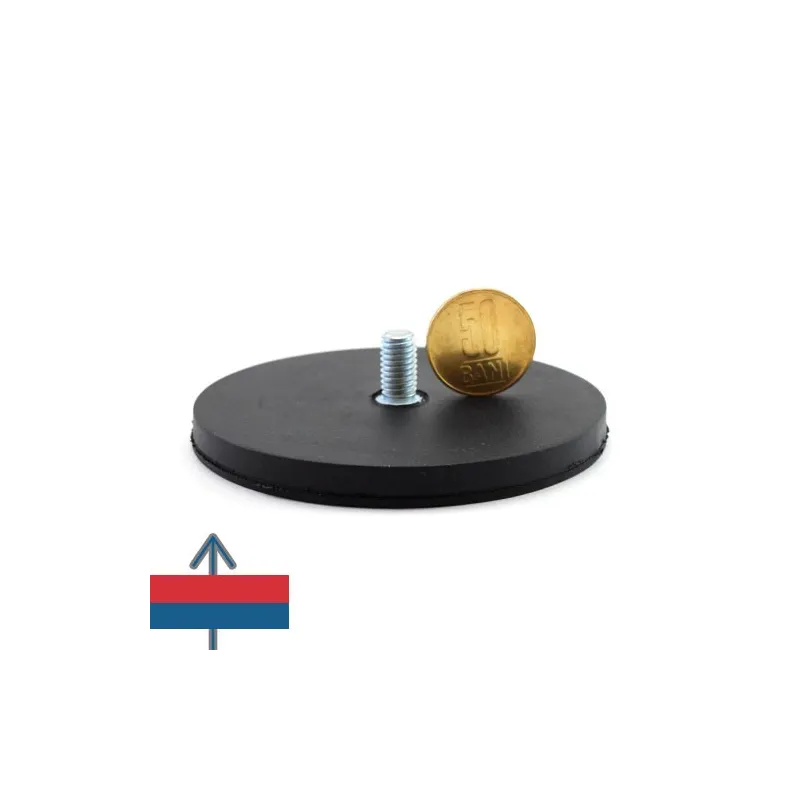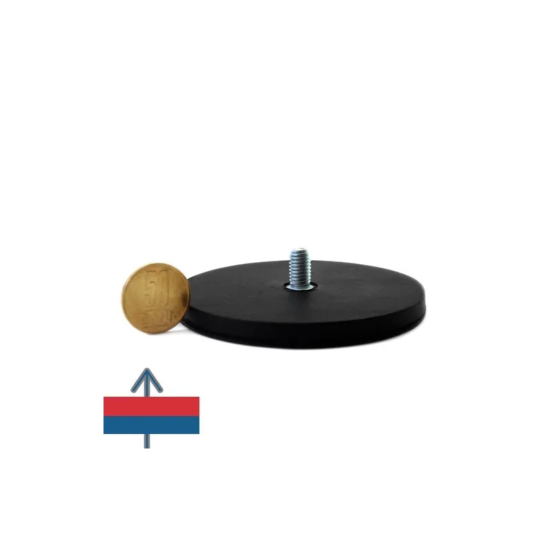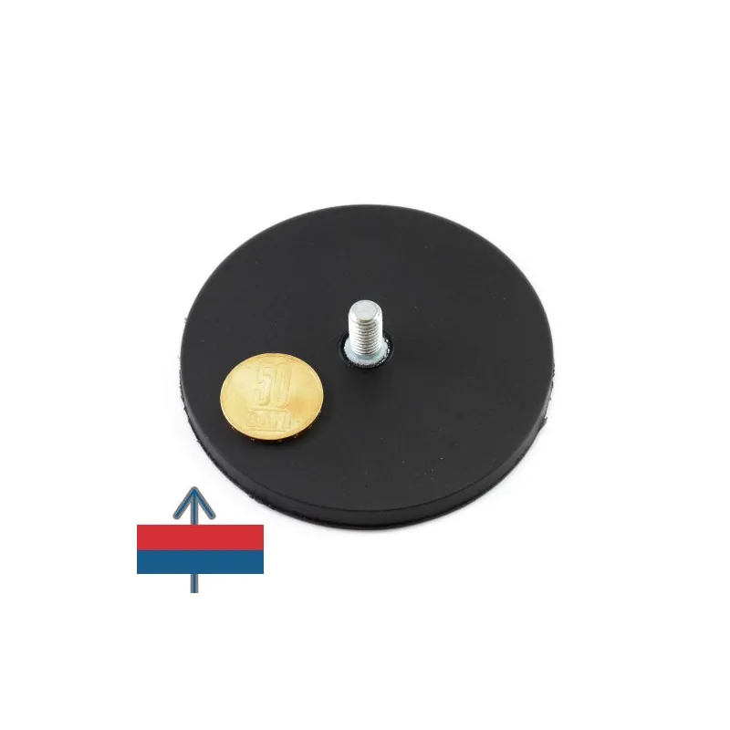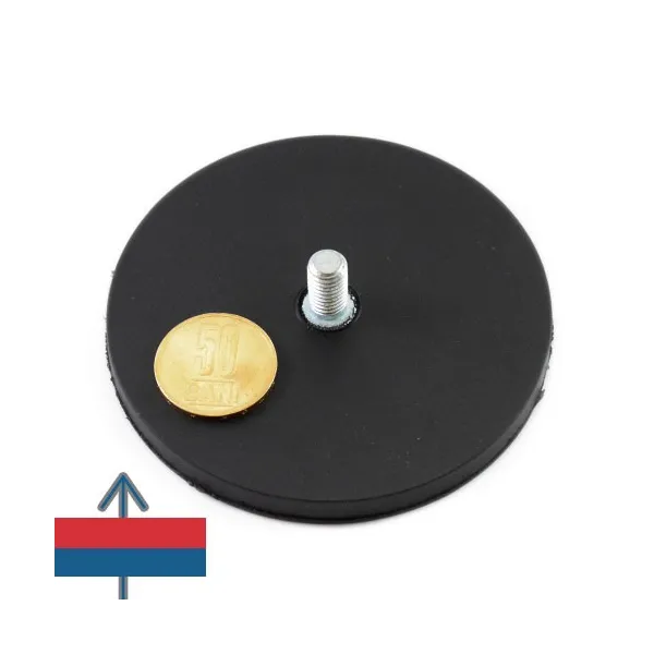 Силен неодимов магнит тип „тенджера“, никелово покритие, с диаметър 88 мм, каучуково покритие, с външна резба M8 и приблизителна сила на задържане 55 кг при контакт.