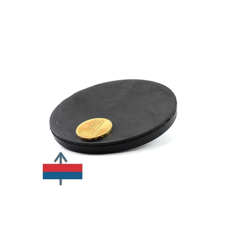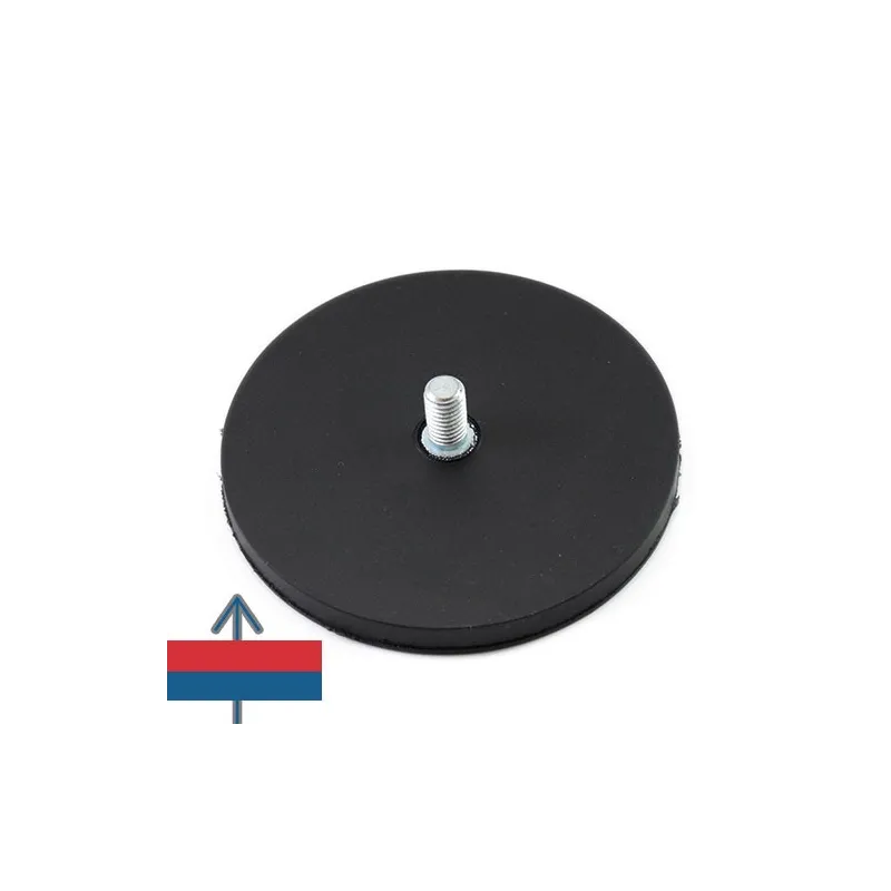 Магнит тип „тенджера“ с плоска форма, диаметър 88 мм, покрит с каучук и с външна резба M8. Ядрото е неодимов магнит с магнитизация N35 и сила на задържане до 55 кг при идеални условия. Силата на задържане може да варира значително в зависимост от конкретните условия на приложение, затова е препоръчително да се тества предварително и да не се разчита само на посочената стойност. Резбата е „мъжки“ тип, предназначена за използване с шайба и гайка. Каучуковите магнити тип „тенджера“ са полезни при работа с чувствителни повърхности, които трябва да се предпазят от надраскване, като стъкло, пластмаса или боядисана автомобилна каросерия. Каучукът също така предпазва магнита от корозия в морска, водна или външна среда, както и в случаи на удар или сблъсък на магнита с метални предмети, например при механична обработка или работа с мотори. Тези каучукови магнитни „тенджери“ често се използват за създаване на точки за захващане или окачване. Каучуковото покритие осигурява по-добра устойчивост на плъзгане благодарение на по-голямото триене между каучука и металната контактна повърхност. Индустриалните производители често използват тези каучукови магнитни „тенджери“ за носещи или закрепващи задачи. Продуктите или устройствата, фиксирани с каучукови магнити, позволяват лесно отделяне за периодично почистване или поддръжка, което увеличава издръжливостта и улеснява употребата. Каучуковите магнитни „тенджери“ са успешно използвани в пластмасовата индустрия, тъй като обикновено не деформират или пробиват пластмасовите материали. За туристи на палатка, шофьори на камиони, таксиметрови шофьори и спешни служби, тези каучукови магнити могат да създадат временно сигурна точка за закрепване на печати, знаци, фенери или сирени, радио антени, таксиметрови емблеми, като каучукът предпазва боята на автомобила. Захващането е достатъчно здраво, за да осигури стабилност независимо от скоростта на вятъра.