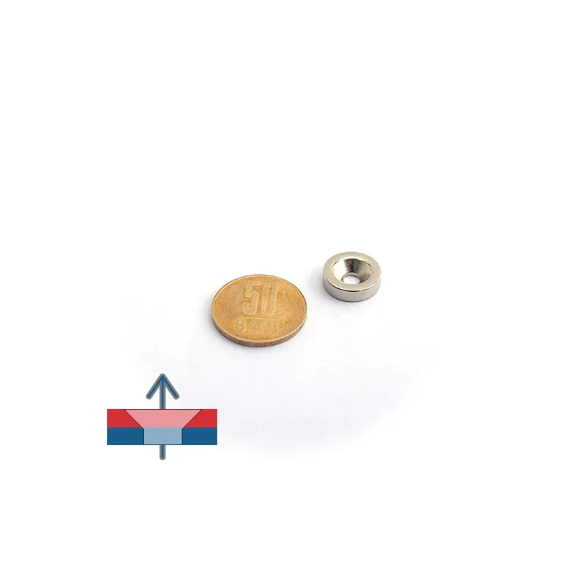 Неодимови магнити с основна цилиндрична (дискова) форма и вграден отвор в средата. Този отвор позволява фиксиране на магнитите с винтове. С дебелина само 4 мм, тези магнити са много дискретни и полезни при изработване на мебели и модерни кухни, при изработка на рафтове за изложба в магазини, както и за окачване на различни предмети като инструменти, знаци и др.