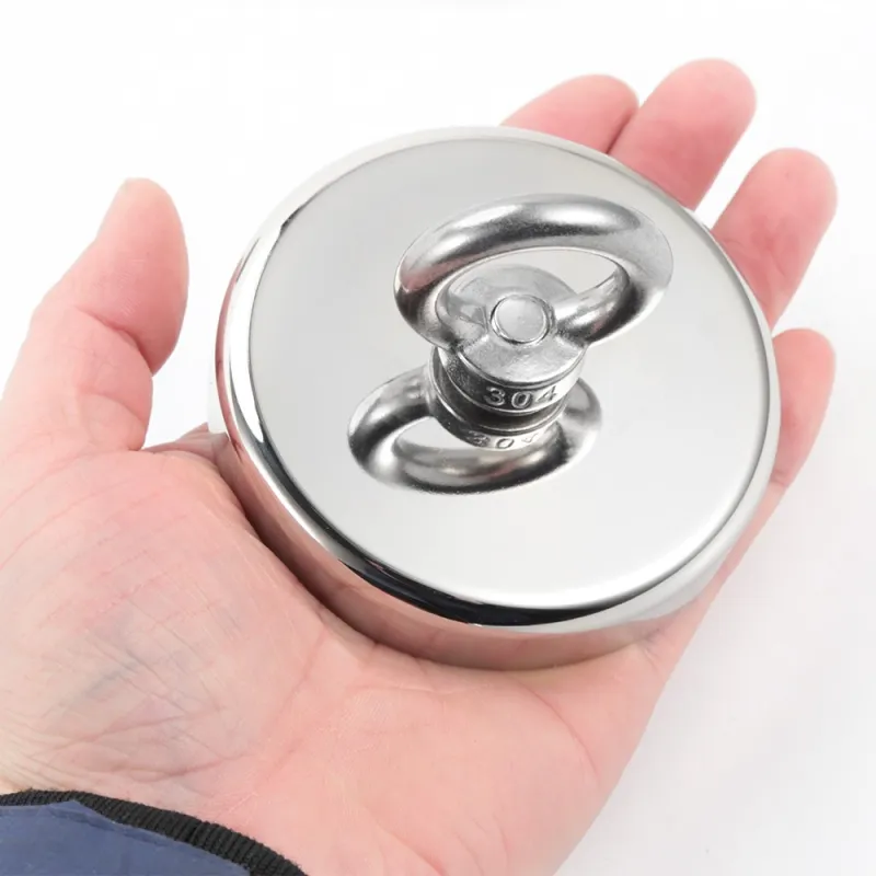 Силен неодимов магнит тип „тенджера“, никелово покритие, с диаметър 90 мм и сила на задържане 250 кг при контакт. Тези класически неодимови магнити са идеални за магнитен риболов.