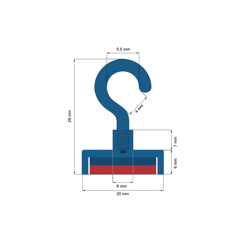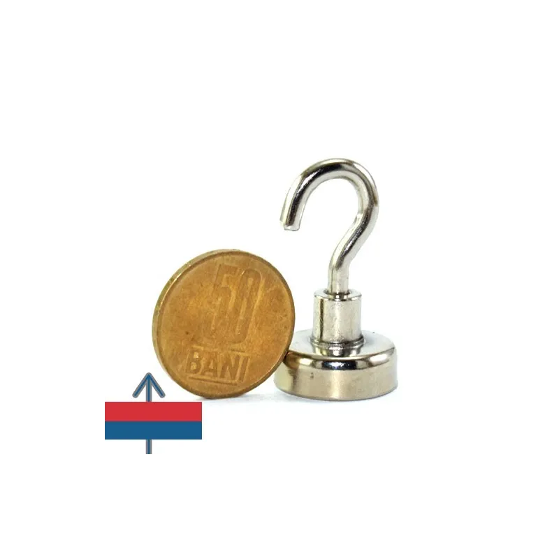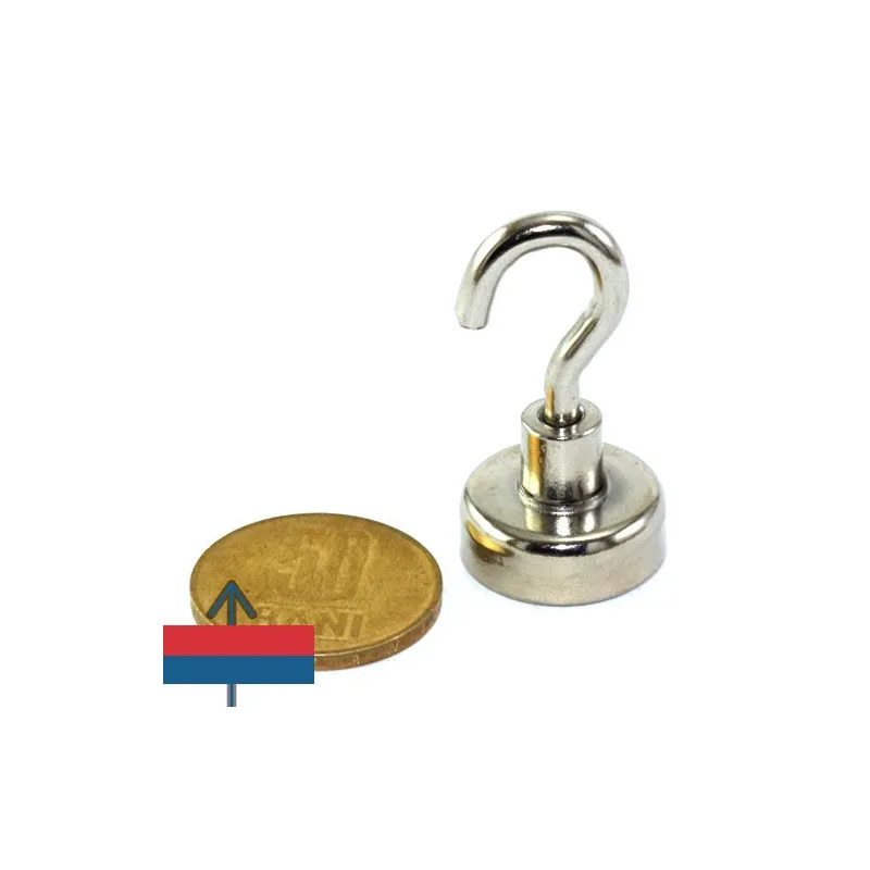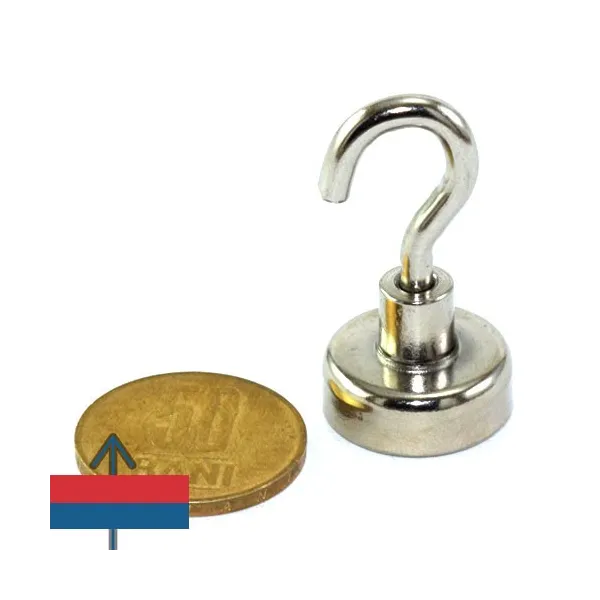 Мощен магнит тип „тенджера“ с диаметър 20 мм и сила на задържане 9 кг. Ако ъгълът на отделяне е различен от 90°, силата намалява, тоест при залепване на магнит на стена силата на задържане ще бъде значително по-малка. Куката е навита и може да се сваля. Ядрото е неодимов магнит, а корпусът е от стомана с никелово покритие. Може да се използва за закачане на различни предмети в дома или в офиса (кухненски пособия, дрехи, планове и др.), реклами, рекламни табла и др.