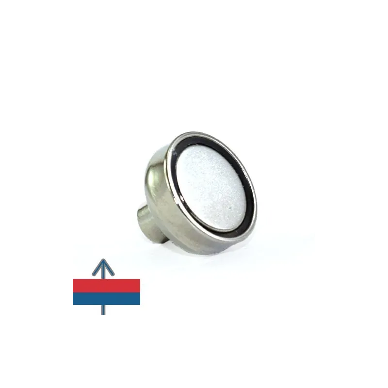 Силен неодимов магнит тип „тенджера“, никелово покритие, N35, с диаметър 20 мм и сила на задържане около 9 кг при контакт.