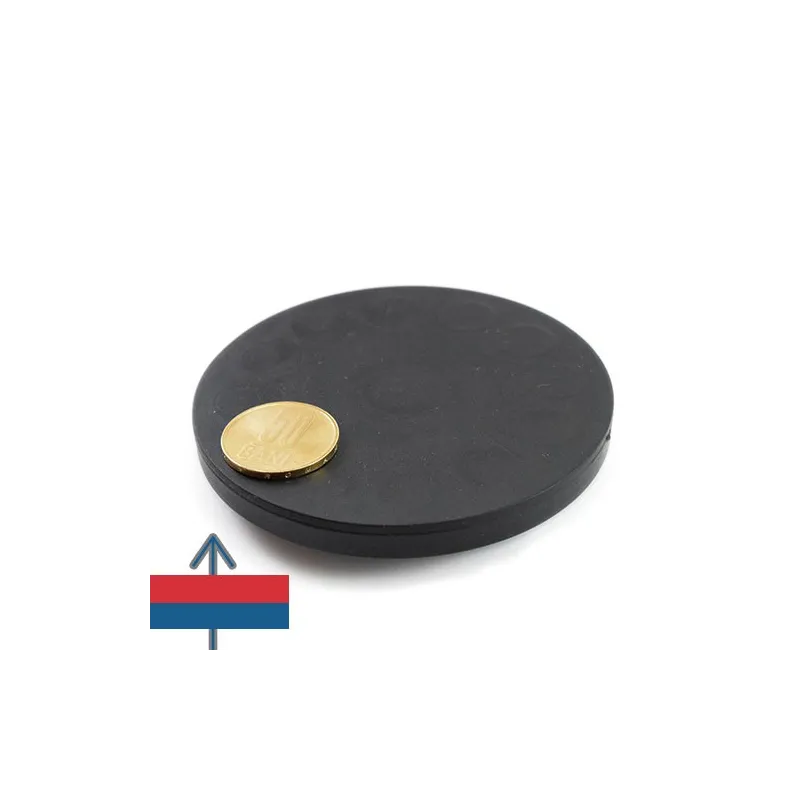 Силен неодимов магнит тип „тенджера“, каучуково покритие, с приблизителна сила на задържане 55 кг, диаметър 88 мм и дебелина 8,5 мм.