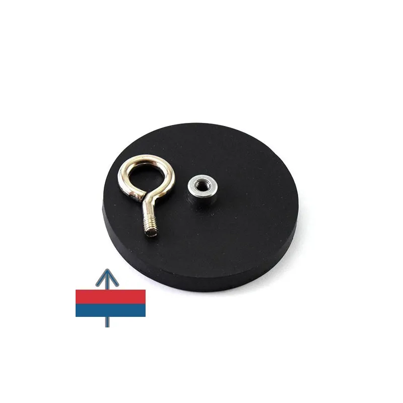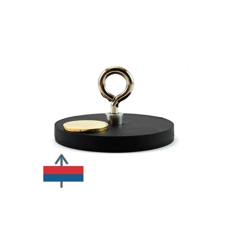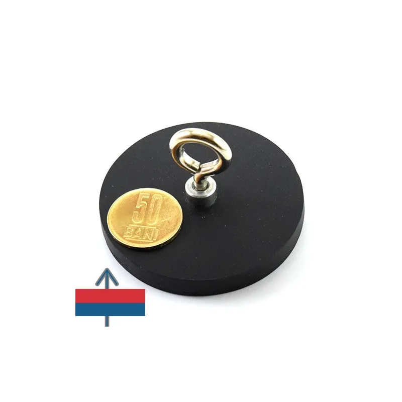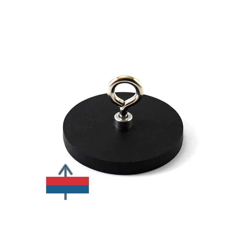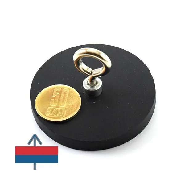 Силен неодимов магнит тип „тенджера“, покрит с каучук, с приблизителна сила на задържане 25 кг, диаметър 66 мм и дебелина 8,5 мм, оборудван с въртяща се кука с вътрешна резба стандарт M5.