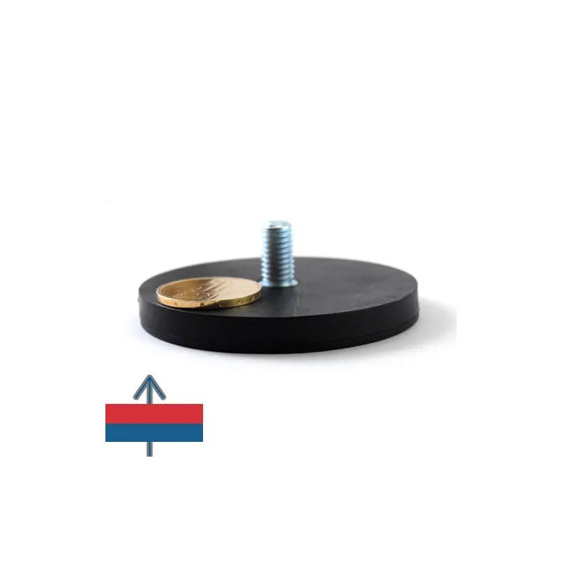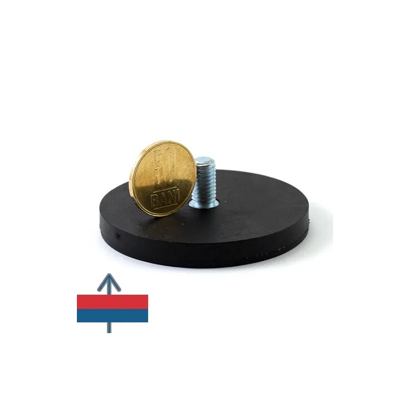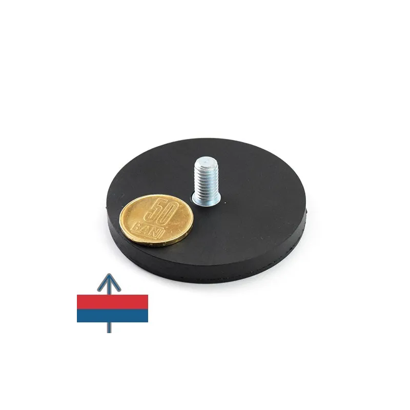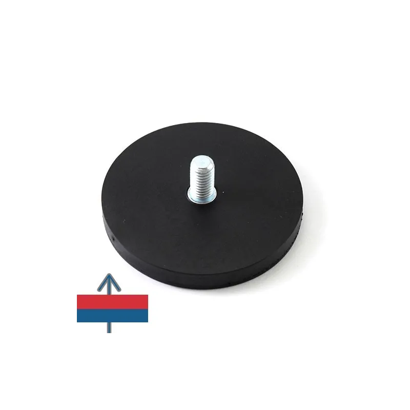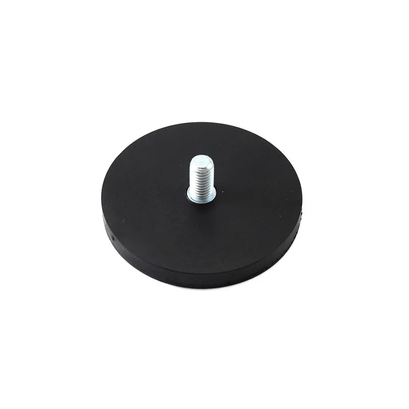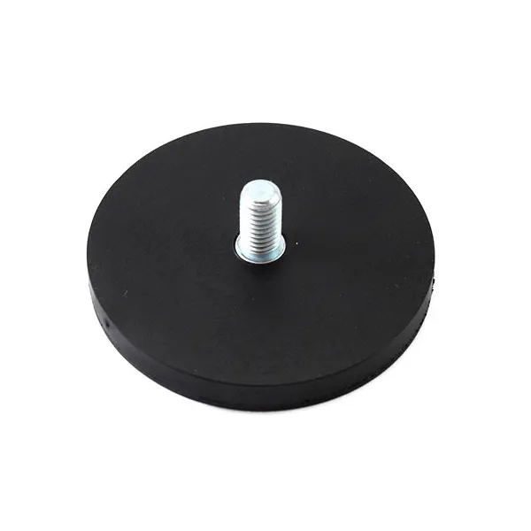 Силен неодимов магнит тип „тенджера“, покрит с каучук, с приблизителна сила на задържане 25 кг, диаметър 66 мм и дебелина 8,5 мм, с външна резба за монтаж.