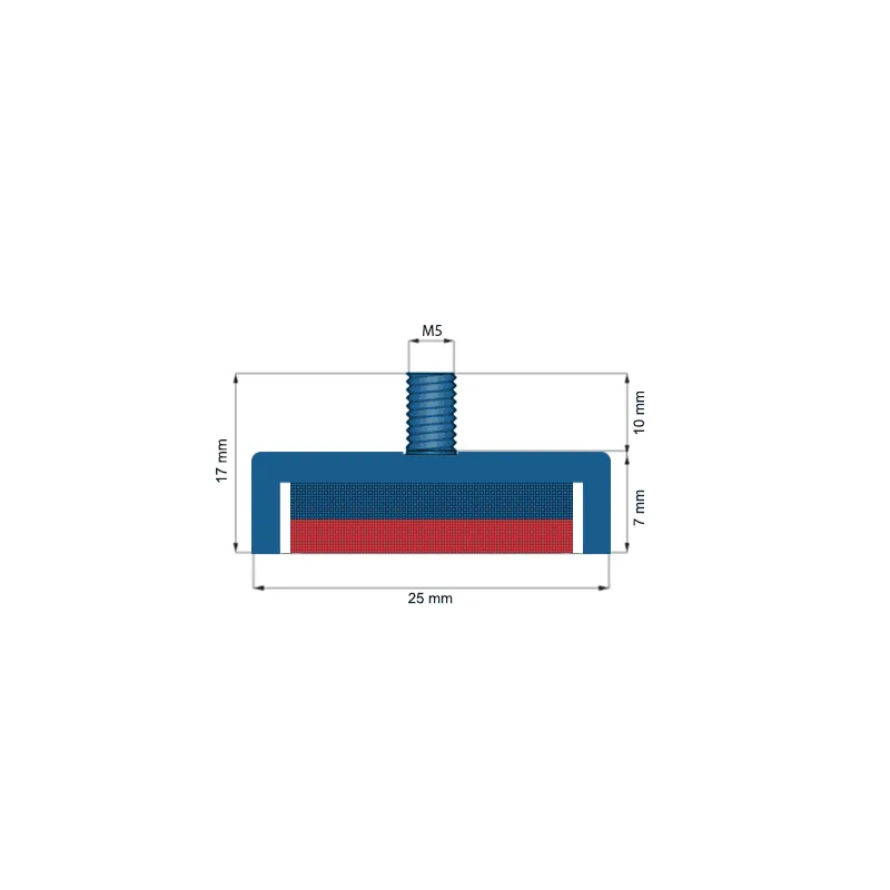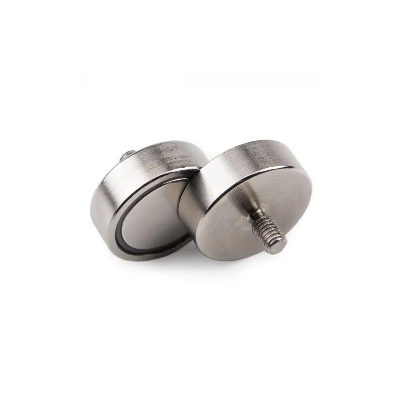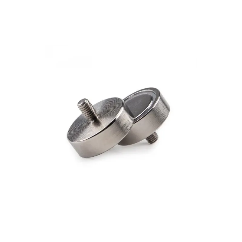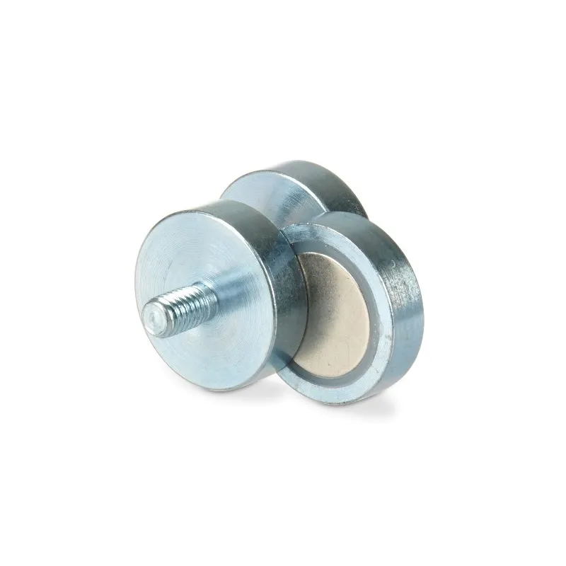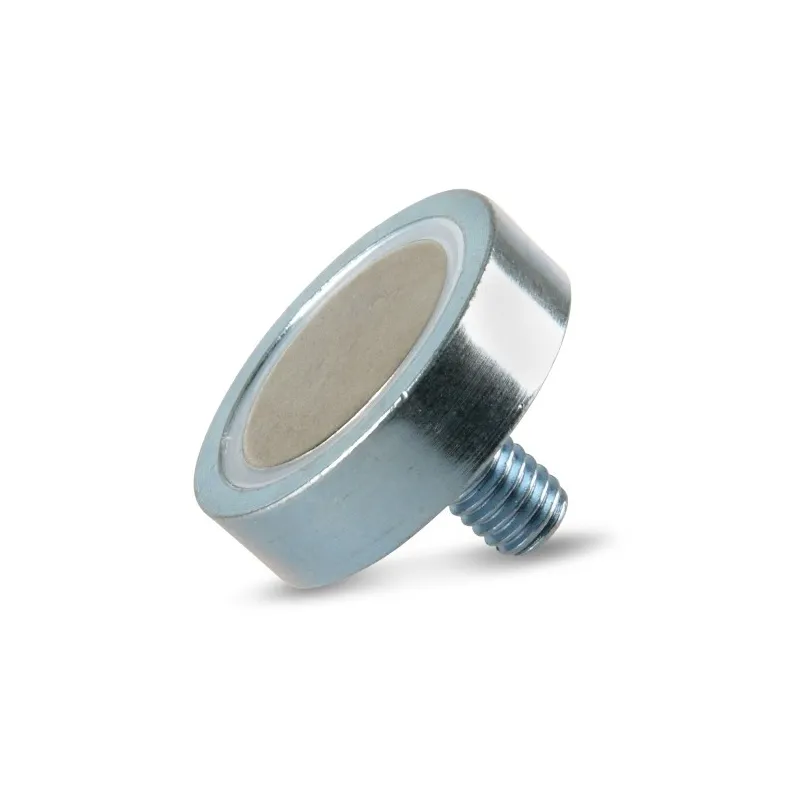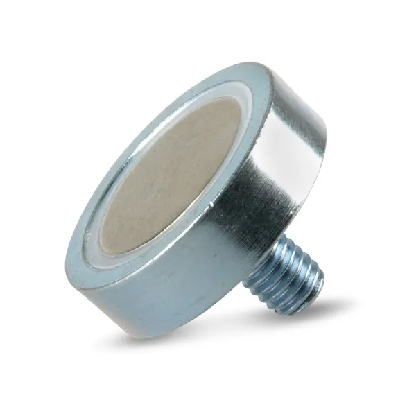 Магнит тип „тенджера“ с постоянно закрепен външен резбов щифт. Ядрото е неодимов магнит, а корпусът е изработен от стомана и покрит с никел. Идеален за монтаж в отвор и фиксиране от другата страна с гайка. Често се използва в автомобилната и пластмасовата индустрия.