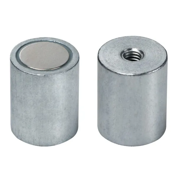 Силен неодимов магнит тип „тенджера“ D 13 мм x В 20 мм с вътрешна резба, с корпус от галванизирана стомана, диаметър 13 мм и приблизителна сила 6 кг при контакт.
