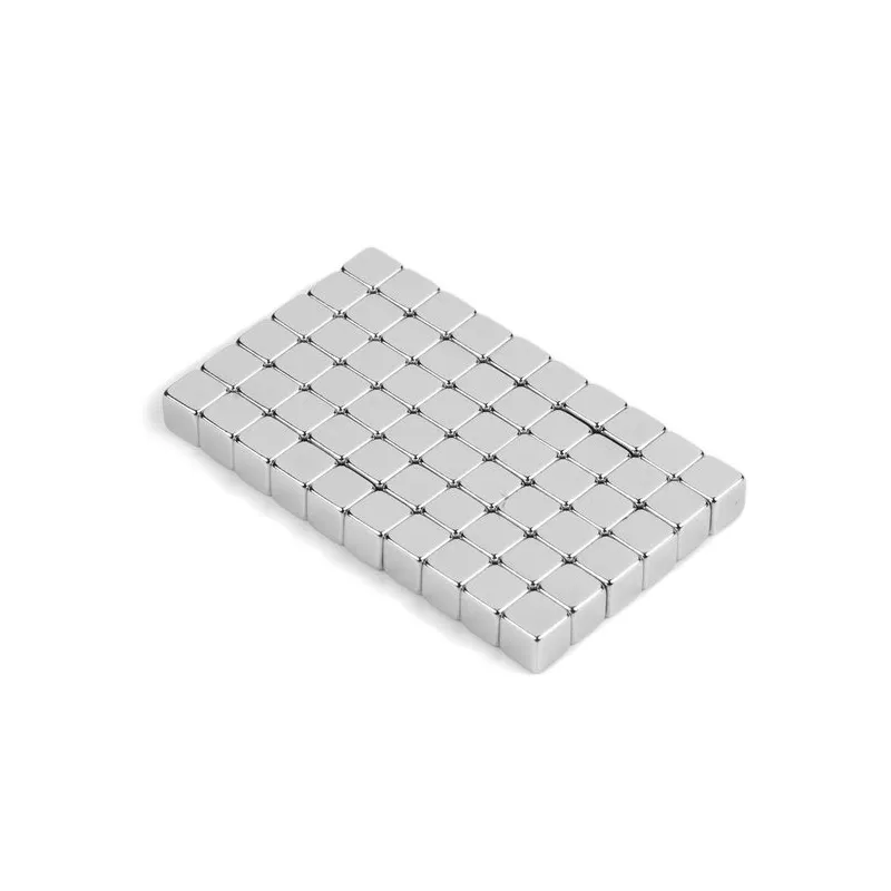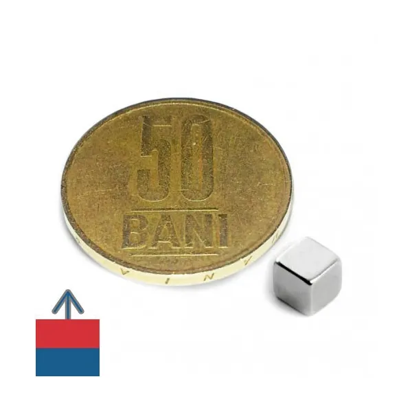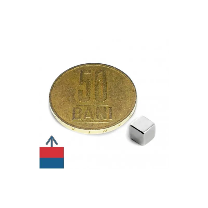 Силен неодимов магнит, кубична форма, никелирано покритие, магнитизация N52, приблизителна сила 1,3 кг