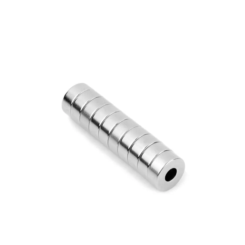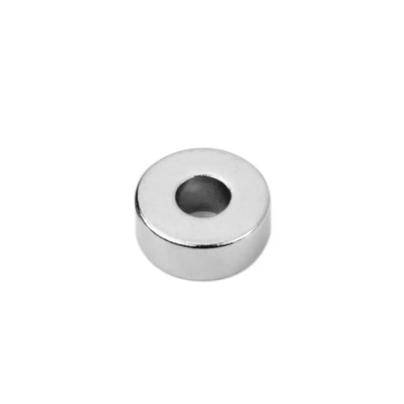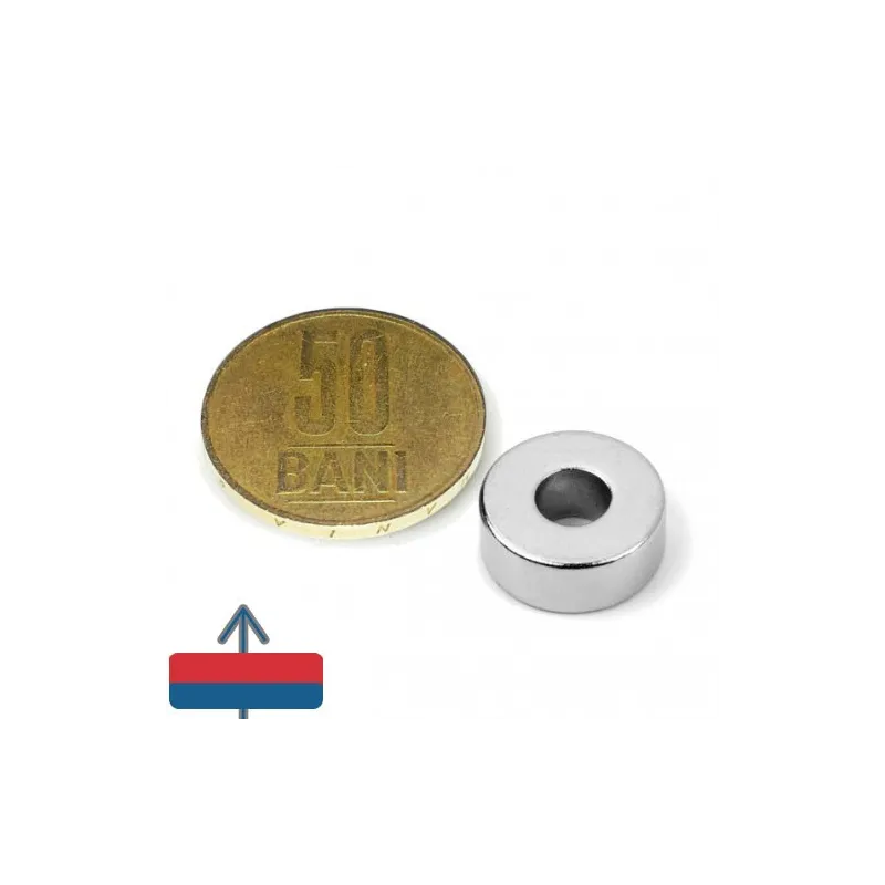 Мощен неодимов магнит, форма пръстен, покрит с никел, N45, приблизителна сила 145 кг. Магнитизацията е осева, което означава, че полюсите на магнита са на плоските кръгли лица с диаметър 100 мм и отвор 50 мм.
