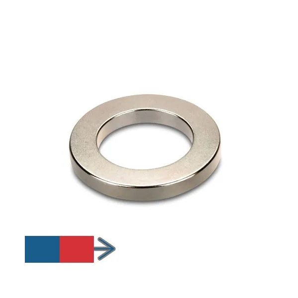 Мощен неодимов магнит с пръстеновидна форма и диаметрална магнитизация – полюсите са разположени върху извитата повърхност, като всеки заема половината от диаметъра. С други думи, пръстените с диаметрална магнитизация се привличат встрани и не са една върху друга. Тази магнитизация е по-рядко срещана, тъй като възможностите за приложение са по-специфични: електрически мотори, експерименти или научни демонстрации, инженерни проекти и др. Този модел не е подходящ за прости задачи като закрепване или привличане и за такива цели препоръчваме неодимови магнити с осева магнитизация.