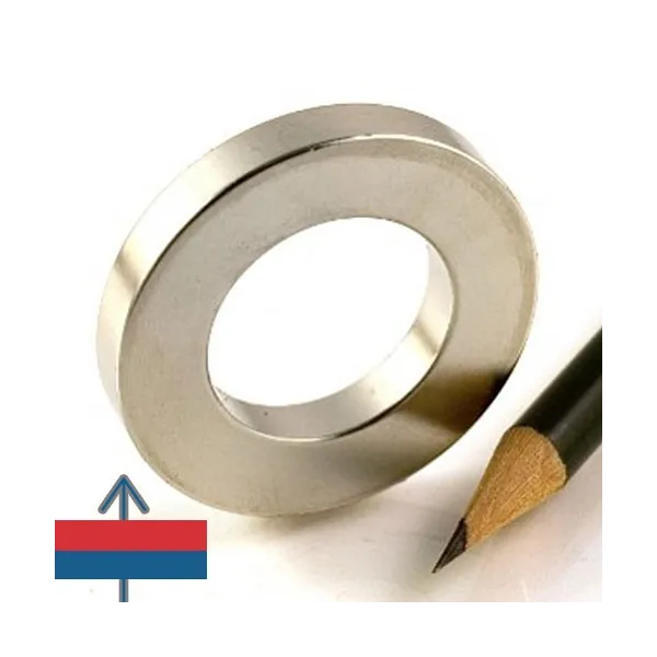 Този неодимов магнит тип пръстен има адхезивна сила до 9 кг при идеални условия и е с елегантен вид благодарение на никеловото покритие. Магнитите са с много добра устойчивост на размагнитване – губят само 1-2% от магнитната си сила за 10 години. Неодимовите пръстени често се използват в индустриални приложения като: