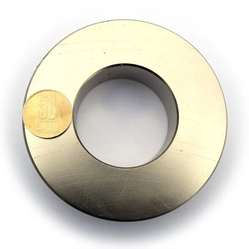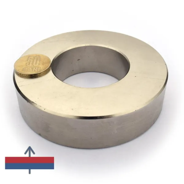 Мощен неодимов магнит, форма пръстен, покрит с никел, N45, приблизителна сила 145 кг. Магнитизацията е осева, което означава, че полюсите на магнита са на плоските кръгли лица с диаметър 100 мм и отвор 50 мм.