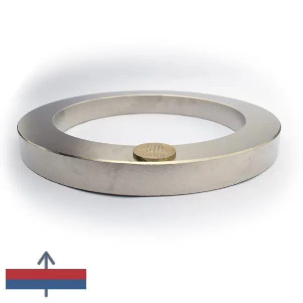 Мощен неодимов магнит, форма пръстен, покрит с никел, N45, приблизителна сила 13,5 кг. Неодимови магнити с най-добро съотношение сила/обем. Неодимов магнит тип пръстен с мощна адхезивна сила до 13,5 кг при идеални условия.