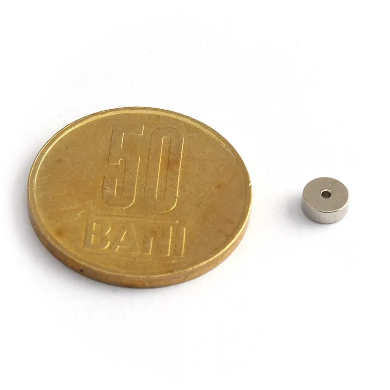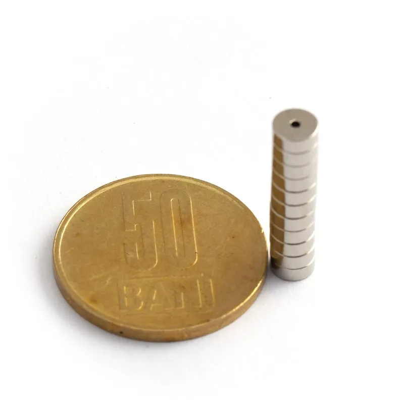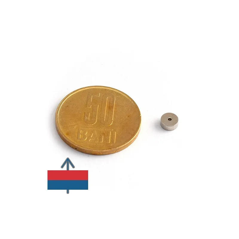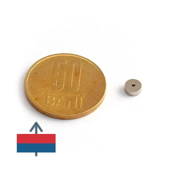 - Магнитизацията е осева, което означава, че полюсите на магнита са на плоските кръгли повърхности с диаметър 5 мм и отвор с диаметър 1 мм;