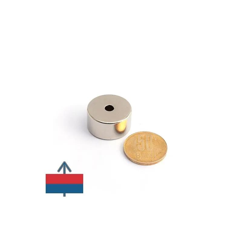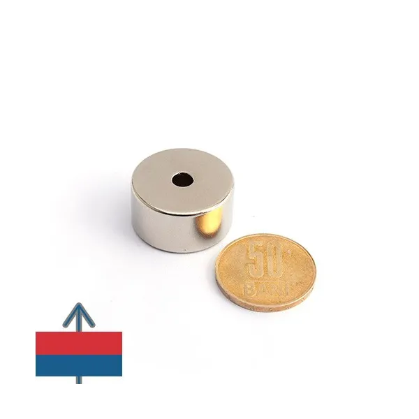• Магнитизацията е осева, което означава, че полюсите на магнита са на плоските кръгли повърхности с диаметър 25 мм и отвор с диаметър 5 мм;
