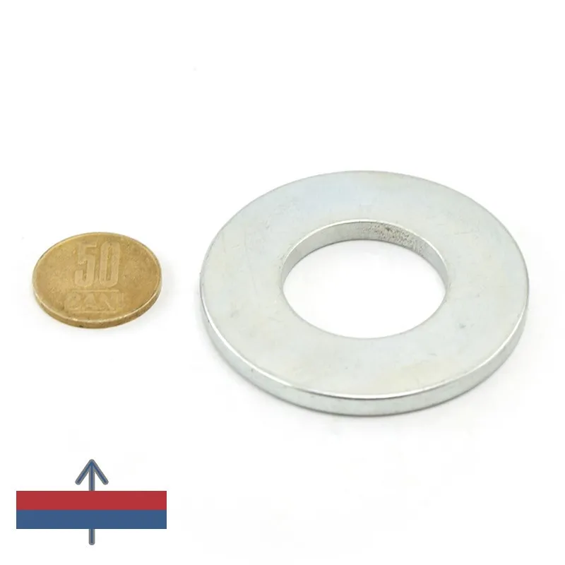 Неодимови магнити, форма пръстен, покрити с никел, намагнитеност N45, приблизителна сила 700 г, диаметрална магнитизация. Магнит с диаметрална магнитизация, полюсите са разположени по диаметъра на пръстена.