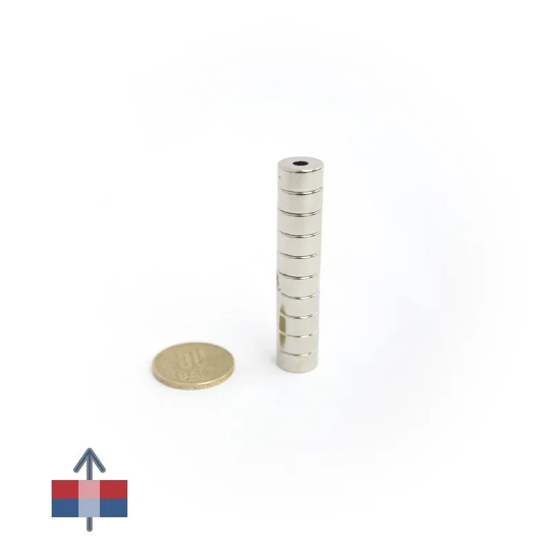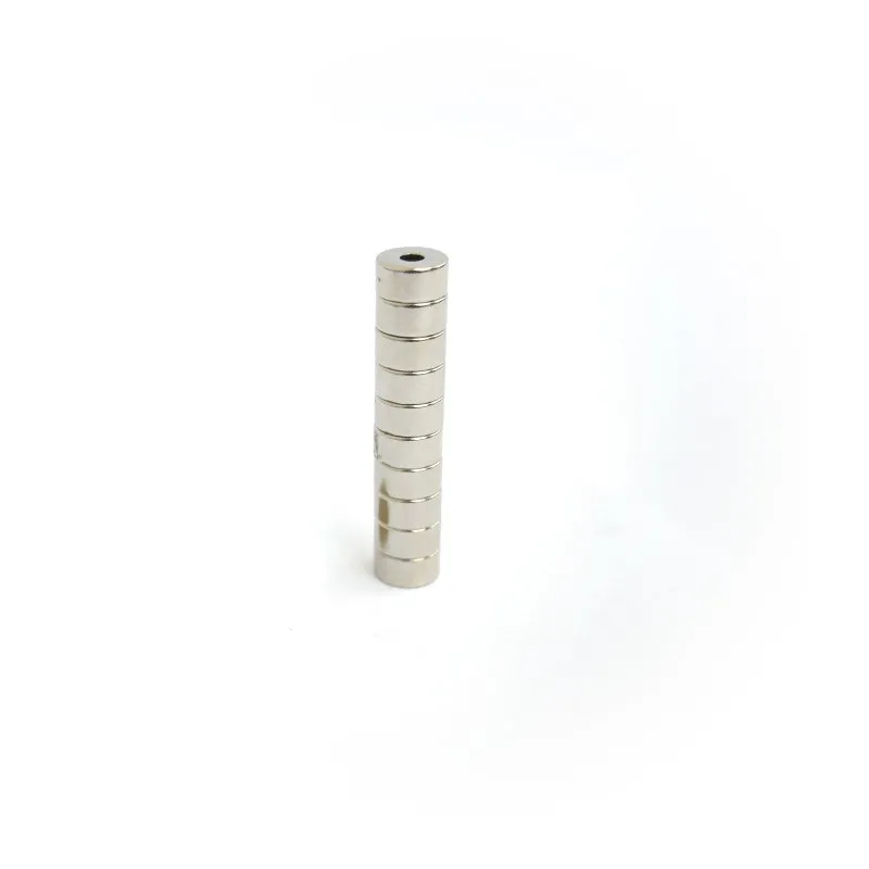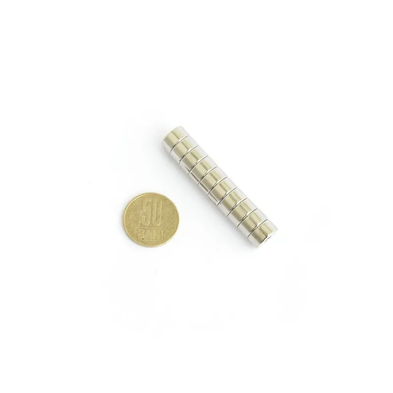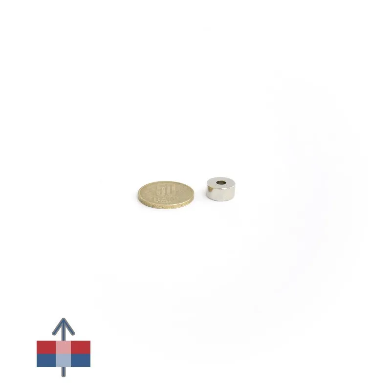 Мощен неодимов магнит, форма пръстен, покрит със злато, N52, приблизителна сила 3,4 кг. Неодимови магнити с най-добро съотношение сила/обем. Магнитизацията е осева, което означава, че полюсите на магнита са на плоските кръгли лица с диаметър 17,4 мм и отвор 11 мм.